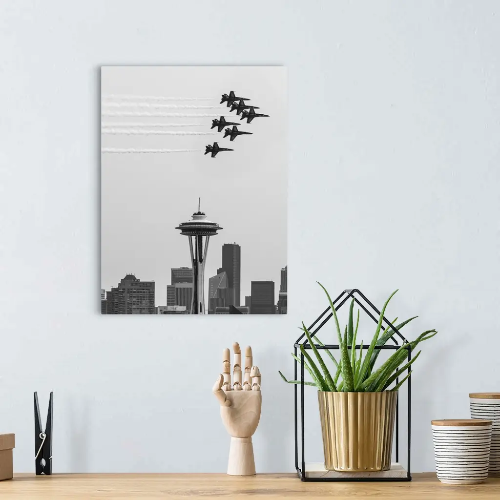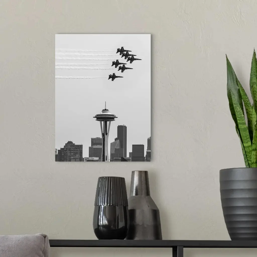 Black and white photograph of Navy jets flying over the Seattle Space Needle.