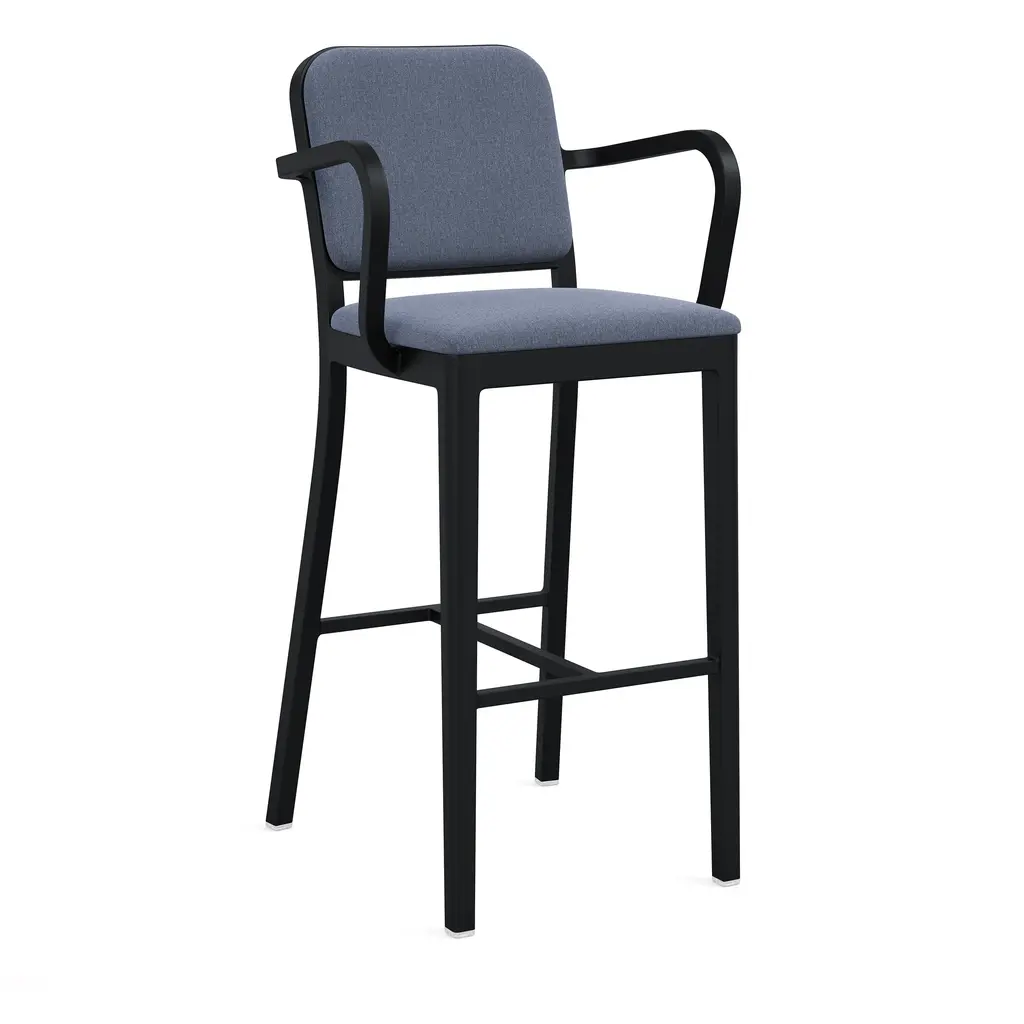 Designed by Jasper Morrison for Emeco, the Navy Officer Outdoor Bar and Counter Stool with Arms offers a premium, modern seating experience for today’s bar settings. Made in the USA, this iconic stool is built for a lifetime of use with a frame crafted from recycled aluminum. The addition of arms enhances the comfort of the upholstered seat and back, which are covered in a high-performance Sunbrella fabric made from 50% recycled acrylic. A fusion of legendary strength and contemporary comfort, it brings an icon of American craftsmanship to any setting. Highlights: