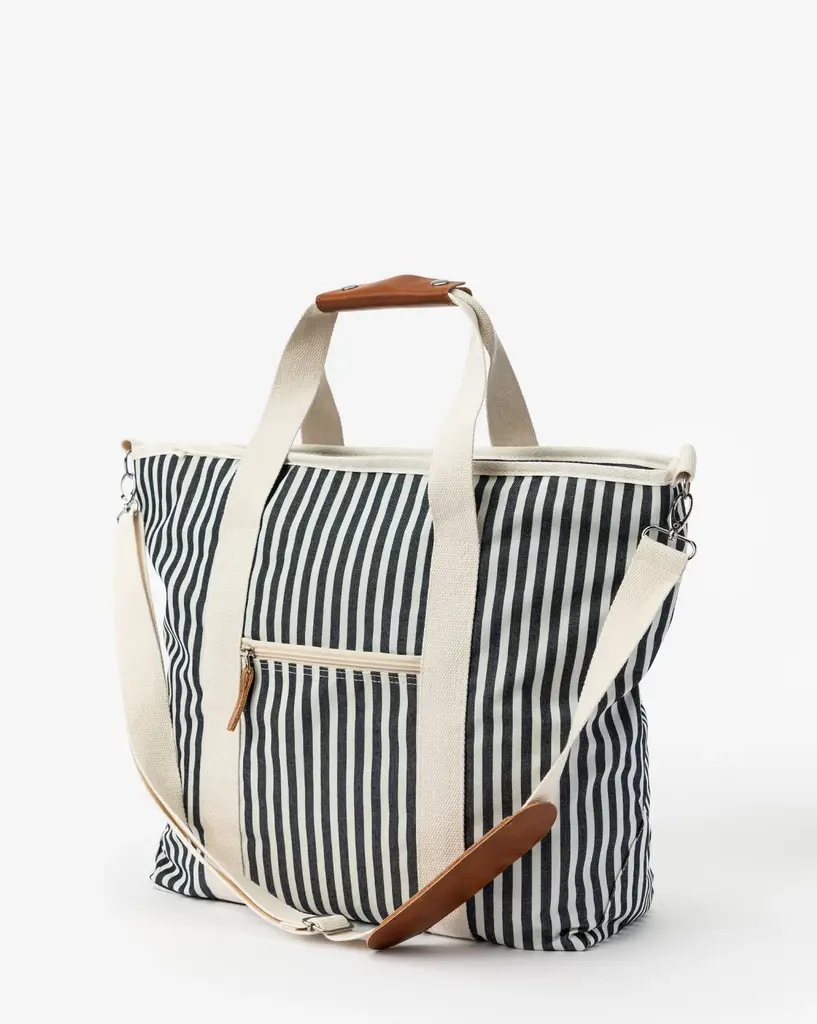 Make the most of the warmer months with the Navy Striped Cooler Bag. Its striped canvas design makes this piece the perfect balance of style and practicality. With a waterproof interior and padding to keep things cool, this bag has plenty of space for any pool day activities.