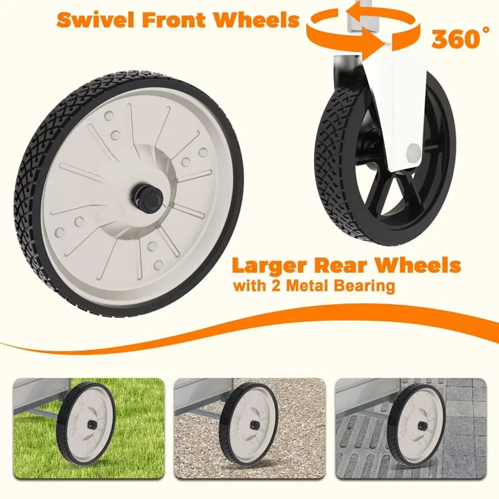 The NAYSAYE Foldable Shopping Dolly is a durable and convenient solution for carrying groceries, laundry, or household items. Its reinforced steel frame and grid bottom support heavy loads while double baskets keep items organized and secure. Smooth swivel front wheels and oversized rear wheels provide quiet, easy movement on sidewalks or uneven surfaces. The included waterproof liner protects small items and maintains privacy. Foldable design allows compact storage, combining strength, functionality, and everyday convenience.