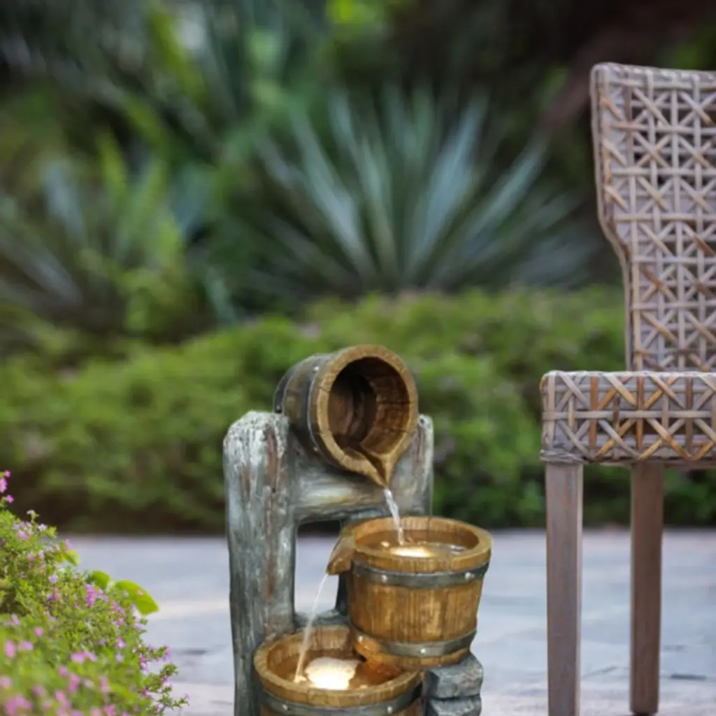 NAYSAYE brings rustic charm to outdoor spaces with this three tier bucket fountain featuring detailed craftsmanship and gentle cascading water. Crafted from durable weather resistant polyresin this fountain maintains its rustic brown finish and intricate details for long lasting use. The flowing water creates a calming and peaceful ambiance ideal for gardens patios or porches. Its organic brown finish complements farmhouse bohemian French country and coastal decor while serving as an eye catching decorative focal point.