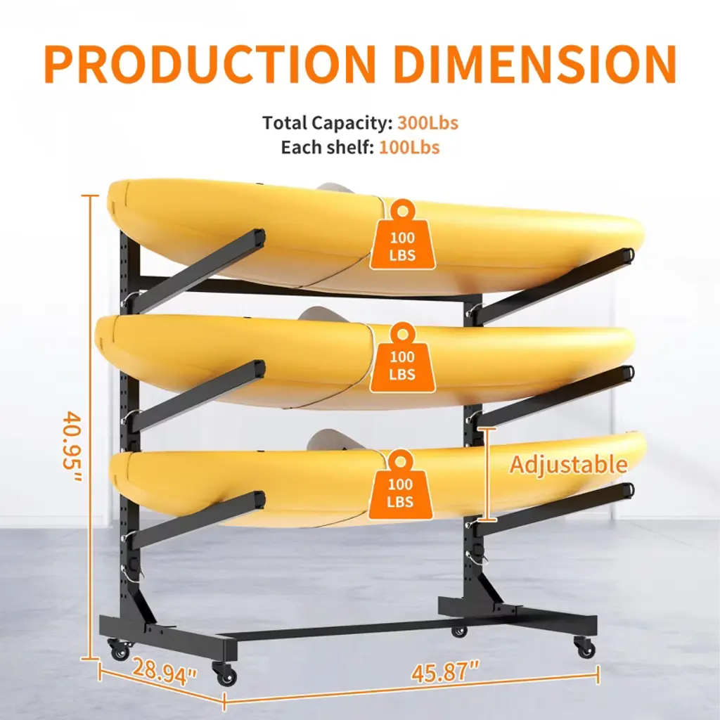 This heavy-duty kayak stand is built from high-quality steel, ensuring exceptional durability and stability, supporting up to 100 lbs per tier. It features 360° movable and lockable wheels for easy positioning, adjustable height, and multi-position arms for various kayak sizes.