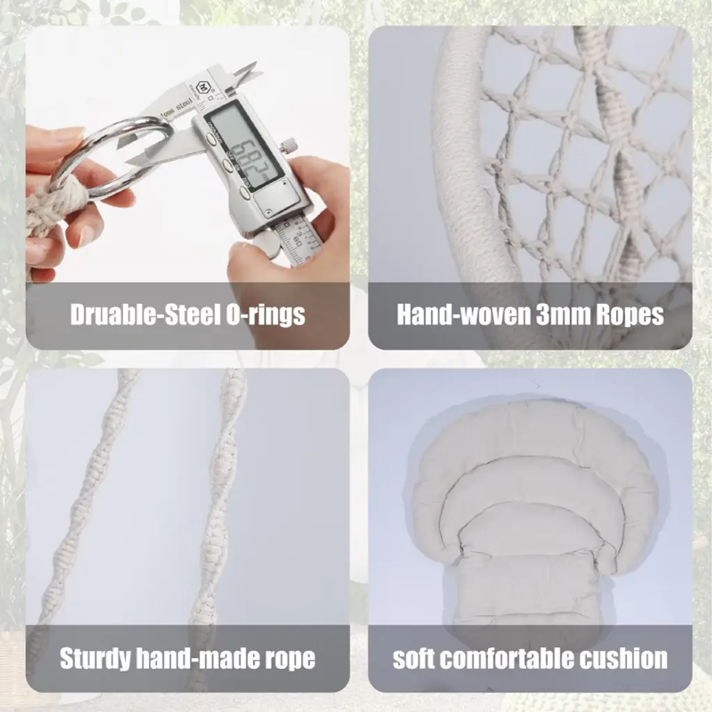 Relax in comfort with the NAYSAYE Patio Swing Hammock Chair. Designed for both indoor and outdoor use, this hammock chair features a sturdy hand woven cotton seat and arched backrest for enhanced support. It can hold up to 330 lbs, providing ample space for full relaxation. The portable design allows for easy setup and storage, perfect for hanging in your bedroom, living room, or garden. Ideal for reading, meditating, or simply unwinding, this chair adds charm and comfort to any space.