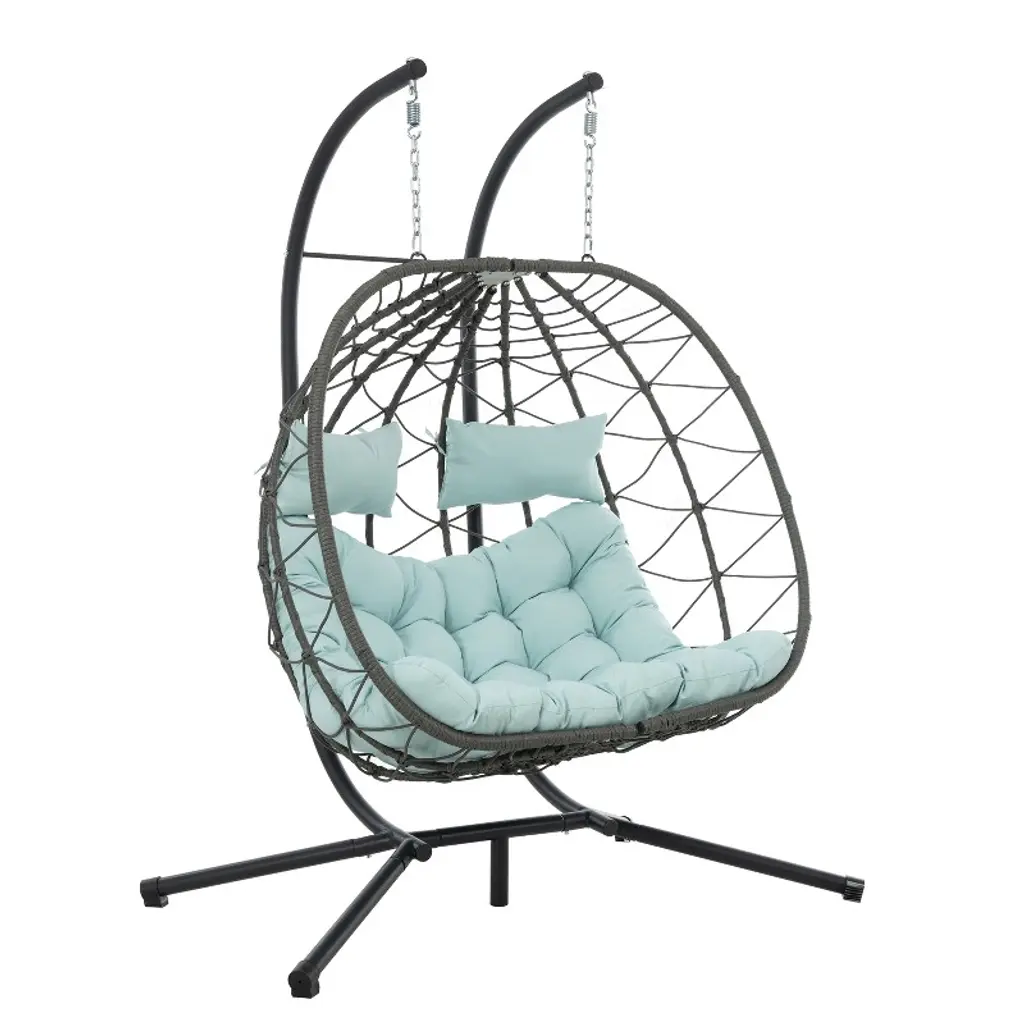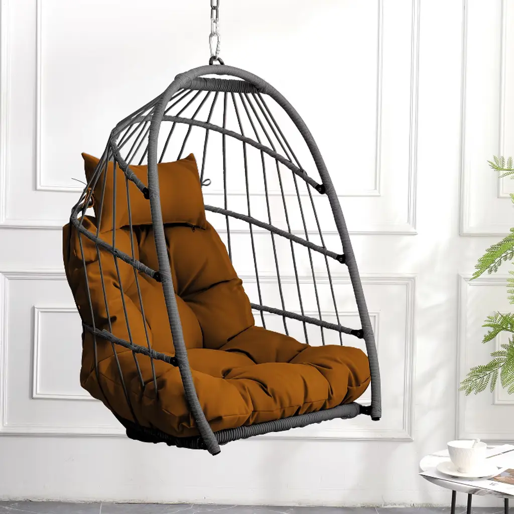Naysaye Patio Swing Rattan Egg Chair With Cushion And Foldable Frame For Garden And Backyard Relaxation, Brown And Gray, 40.5"*28.34"*22"