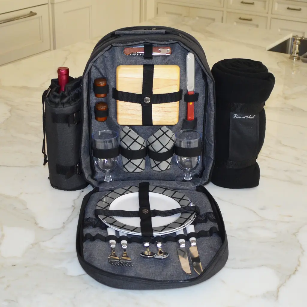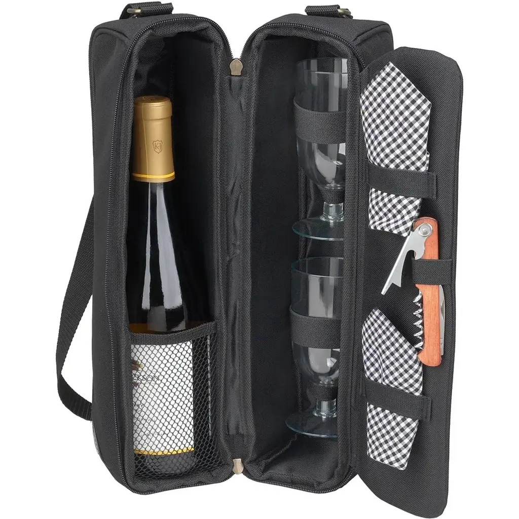 Bordeaux wine and cheese cooler with thermal shield insulation is a creatively designed carrier. This unique set holds 2 bottles and can be used as a 3 bottle carrier with glasses removed. Includes adjustable padded bottle dividers and padded divider between glasses for protection. Dimensions - 13.75" H x 10.5" W x 4" D Sleek and sophisticated wine and cheese tote - insulated to keep two bottles of wine or champagne at the perfect temperature - great for picnics - concerts - beach Includes 2 glass wine glasses - napkins - corkscrew - bottle stopper - cheese knife - hardwood cutting board Constructed with rugged 600 denier canvas and high density thermal insulation - adjustable shoulder strap Padded center dividers to keep wine bottles from clanking - adjustable to accommodate snacks or a third bottle if the glasses are removed, padded divider between glasses Designed by Picnic At Ascot and assembled in the USA - Lifetime Warranty 600D Polycanvas Spot Clean, Air Dry Case, Dishwasher Safe Glasses, Machine Wash and Dry Napkins, Hand Wash and Dry Corkscrew, Cheese Board and Knife Imported