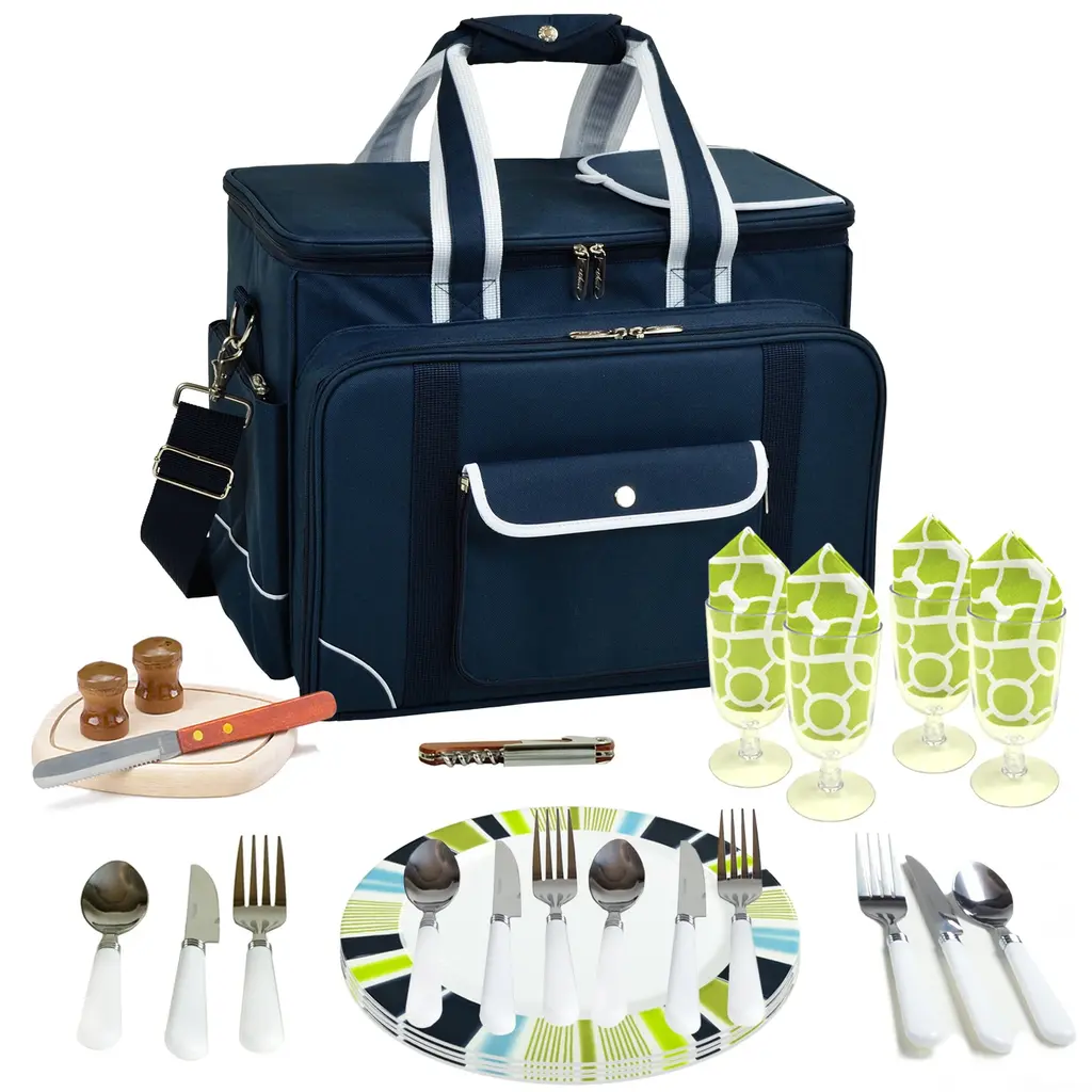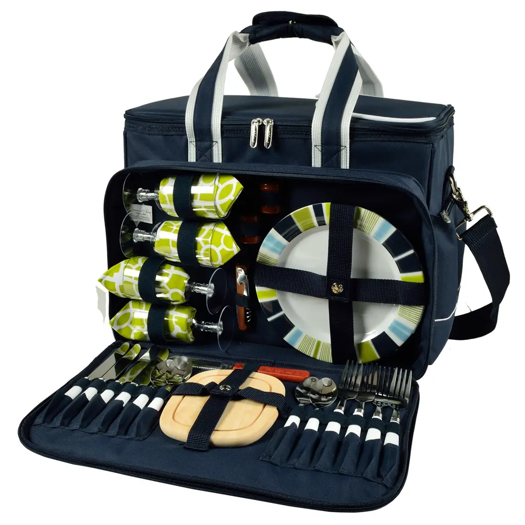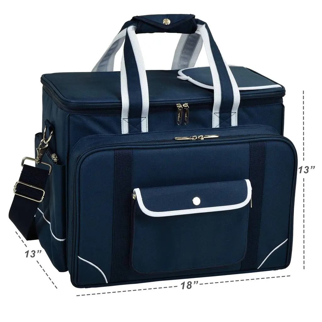 Upscale, thermal shield insulated picnic cooler with service for 4. Unique, waterproof, divided cooler allows drinks to be kept upright and separate from food. Includes combination corkscrew, hardwood cutting board with juice groove, cheese knife, wooden salt and pepper shakers, acrylic wine glasses, 9" melamine plates. Dimensions - 18" W x 13" D x 13" H Ultimate fully equipped picnic cooler for 4 -great for trips to the park - outdoor concerts - sporting events - beach - camping - boating Includes - coordinating 9" melamine plates and napkins- stainless steel flatware - acrylic wine glasses - hardwood cheese board - cheese knife - combination corkscrew - wooden spill proof salt and pepper shakers Spacious leak-proof cooler compartment to keep food and drinks cool for hours - cooler has separate sections for food and 2 bottles - features a pass through opening in the lid for bottles Adjustable shoulder strap and carry handles -constructed with a 600 denier polyester canvas for long life Designed by Picnic At Ascot and assembled in USA - Lifetime Warranty Cotton Tweed, Canvas Dishwasher Safe - Plates, Flatware, Glasses (Glasses Top Rack), Hand Wash and Dry Wood Accessories, Spot Clean Bag and Cooler, Machine Wash and Dry Napkins Imported