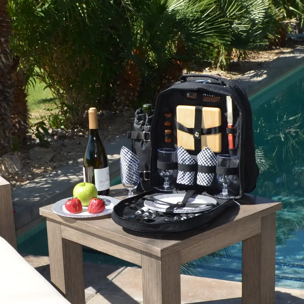 Fully equipped picnic backpack for 2 with detachable insulated wine holder and thermal shield insulated cooler section with leak proof liner, to keep food and drink at the perfect temperature. Includes combination acrylic wine glasses, 9" melamine plates, stainless steel flatware, napkins. Dimensions - 15.5" H x 16" W x 6.5" D High quality fully equipped insulated picnic backpack for 2 constructed with a rugged 600 denier canvas - great for trips to the park - outdoor concerts - beach -and hiking Includes - coordinating 9" melamine plates and napkins- stainless steel flatware - acrylic wine glasses - hardwood cheese board - cheese knife - combination corkscrew - wooden spill proof salt and pepper shakers Cooler compartment with removable leak-proof liner keeps food at the perfect temperature for hours, includes removable insulated wine carrier Adjustable padded shoulder straps - sturdy carry handle - front zippered pocket for keys, cell phones, tickets Designed by Picnic At Ascot and assembled in USA - Lifetime Warranty 600D Polycanvas Dishwasher Safe - Plates, Flatware, Glasses (Glasses Top Rack), Hand Wash and Dry Wood Accessories, Spot Clean Bag and Cooler, Machine Wash and Dry Napkins Imported