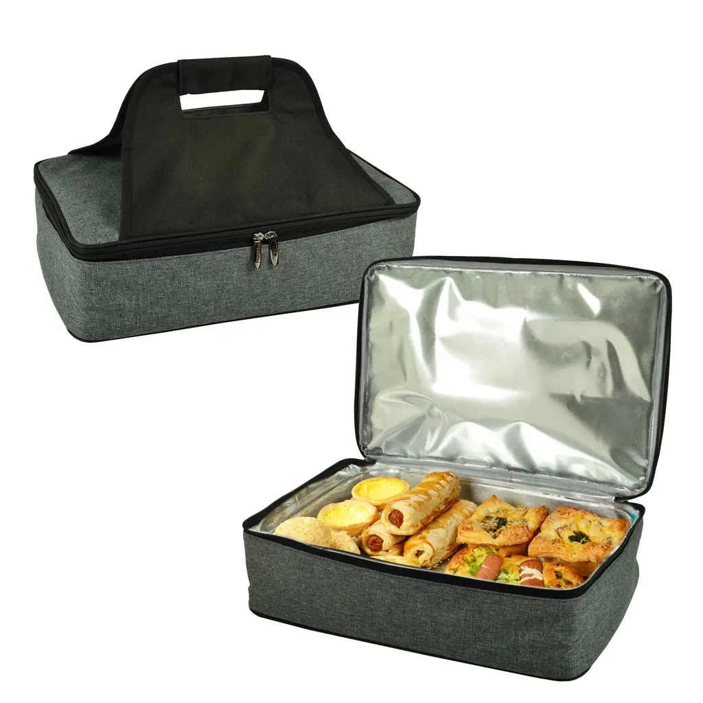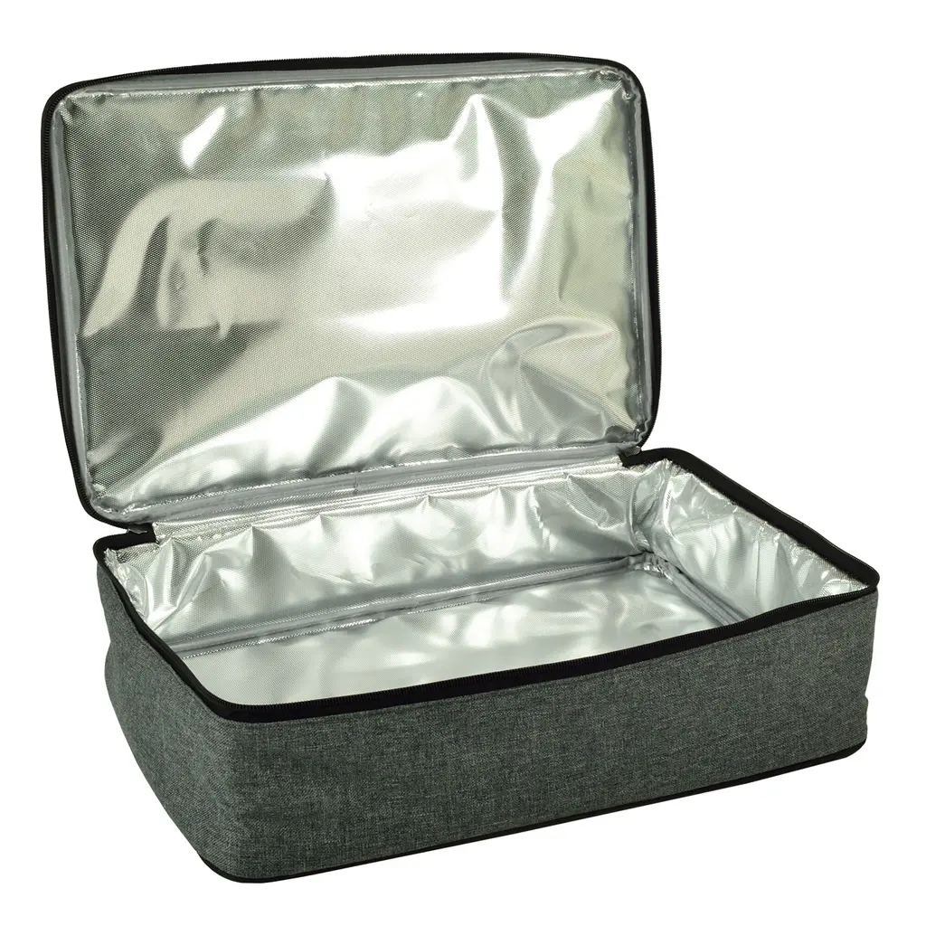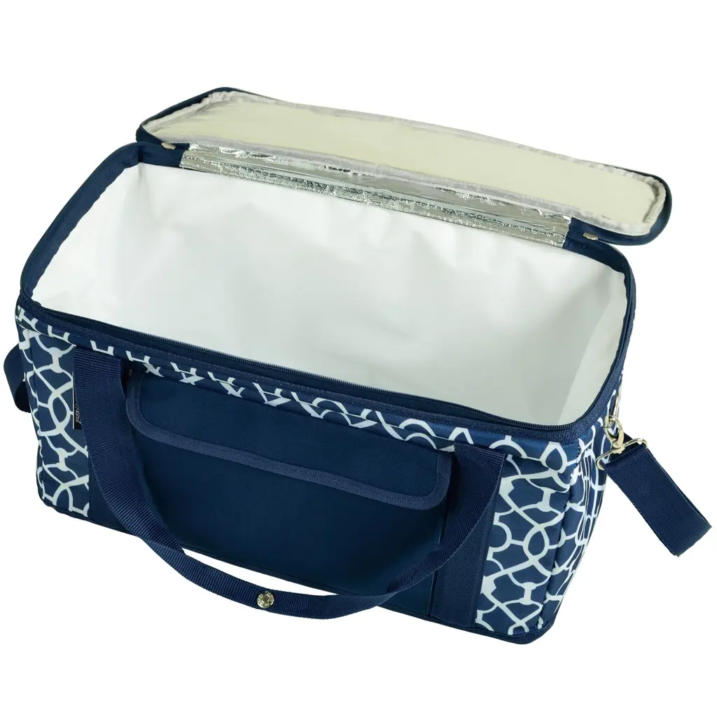 Casserole carrier with sturdy construction and thermal shield insulation to keep food hot or cold during transport. Great to carry casseroles, cakes, rolls, etc. Fits up to an 11" x 15", 5 qt size casserole dish - not included. Features a sturdy centered handle to avoid tipping and zips fully open for easy packing. Dimensions - 18" W x 11" D x 4" H Attractive high quality insulated casserole dish carrier to keep food hot or cold - great for picnics- tailgating - potlucks and when visiting friends Constructed with a rugged 600 denier polyester canvas with high density insulation to prevent heat transfer Great to carry casseroles cakes rolls etc., will fit a 11" x 15", 5 qt size casserole dish Sturdy centered handle to avoids tipping, top sleeve will fit a long serving utensil Makes a great gift - designed by Picnic At Ascot in the USA - Lifetime Warranty 600D Polycanvas Spot Clean and Air Dry Imported