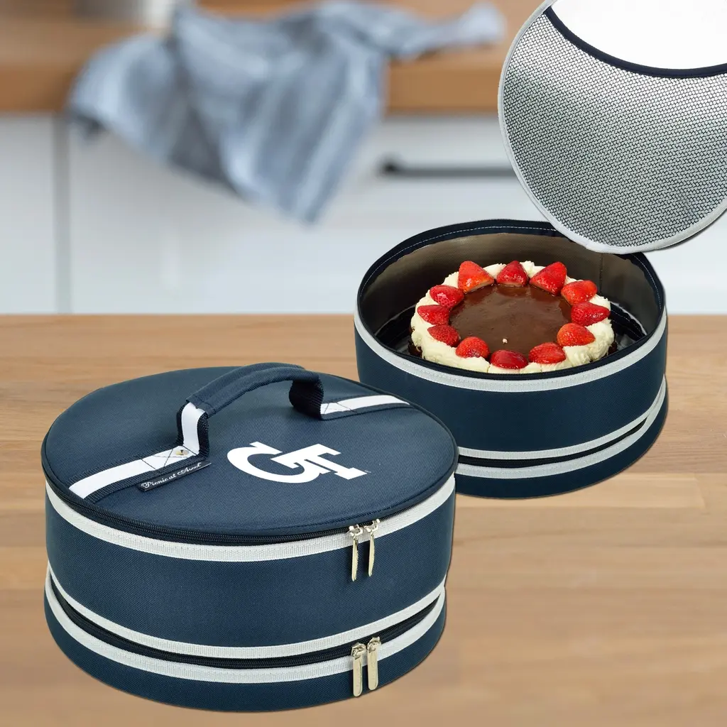 Attractive, highly versatile insulated 12" diameter carrier for cakes, cup cakes, muffins. Pies, appetizers, salads. Dual zippers top and bottom for ease of use. Rigid sides, base, and re-enforced lid assure that top of carrier never sags onto toppings. Foil lined with mesh sleeve pocket inside lid. Safely transports food for tailgating or parties. Dimensions - 12" W x 12" D x 5.75" H High quality pie and cake carrier with zippers top and bottom making it very easy to load and unload cakes and pies into the carrier Great for cakes, cup cakes, pies, appetizers or salads Made with rugged 600 denier polyester canvas with an easy to use top handle Rigid sides, base, and re-enforced lid Designed by Picnic At Ascot in USA - Lifetime Warranty 600D Polycanvas Spot Clean and Air Dry Imported