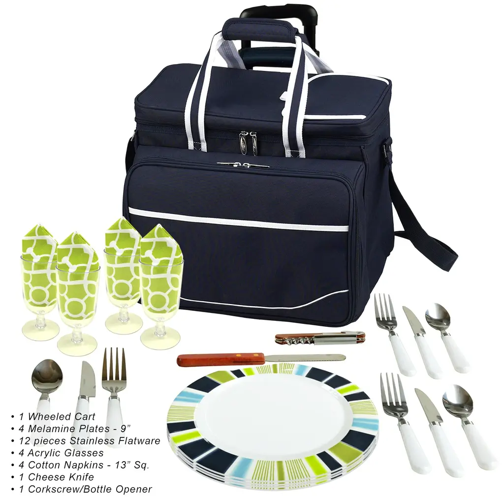 Fully equipped picnic cooler for 4 with removable wheeled cart. Unique, divided thermal shield insulated cooler with separate sections for wine and food. Divider can be detached and folded to the back when a larger cooler space is needed. Easy drinks access panel in lid. Leak proof, safe to used with ice to extend cooling. Dimensions - 14.5" W x 10.5" D x 12.5" H Deluxe fully equipped picnic cooler for 4 - great for trips to the park - outdoor concerts - sporting events - beach - camping and boating Includes coordinating 9" melamine plates and napkins - stainless steel flatware - acrylic wine glasses - cheese knife - combination corkscrew - removable wheeled cart Spacious leak-proof cooler compartment to keep food and drinks cool for hours - cooler has separate sections for food and 2 bottles - features a pass through opening in the lid for bottles Adjustable shoulder strap and carry handles - constructed with a 600 denier polyester canvas for long life Designed by Picnic At Ascot and assembled in USA - Lifetime Warranty 600D Polycanvas Dishwasher Safe - Plates, Flatware, Glasses (Glasses Top Rack), Hand Wash and Dry Wood Accessories, Spot Clean Bag and Cooler, Machine Wash and Dry Napkins Imported