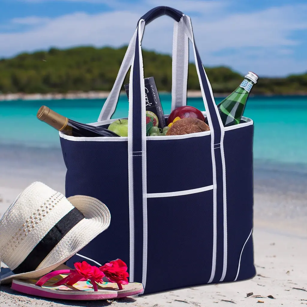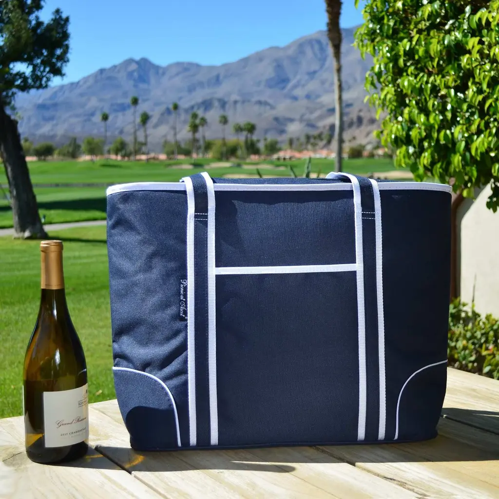This stylish extra large cooler tote-day bag features an easy clean leak proof, food safe lining. Features thermal shield insulation to keep food and drinks cold for hours. It's perfect for picnics and trips to the market. Top zips fully closed, has a convenient front pocket, comfortable shoulder straps, and a reinforced flat bottom. Extra large Dimensions - 20" W x 6" D x 14.75" H, 30 can capacity Stylish high quality insulated cooler tote to keep food and drinks cool for hours - great for picnics - park - concerts - beach - grocery store Constructed with rugged 600 denier canvas with high density thermal insulation - heat welded leak-proof easy clean lining Shoulder length carry straps - front exterior pocket for wallet, keys, or cell phone Has a re-reinforced and flat base, easy to pack Designed by Picnic At Ascot in the USA - Lifetime Warranty 600D Polycanvas Spot Clean, Air Dry Imported