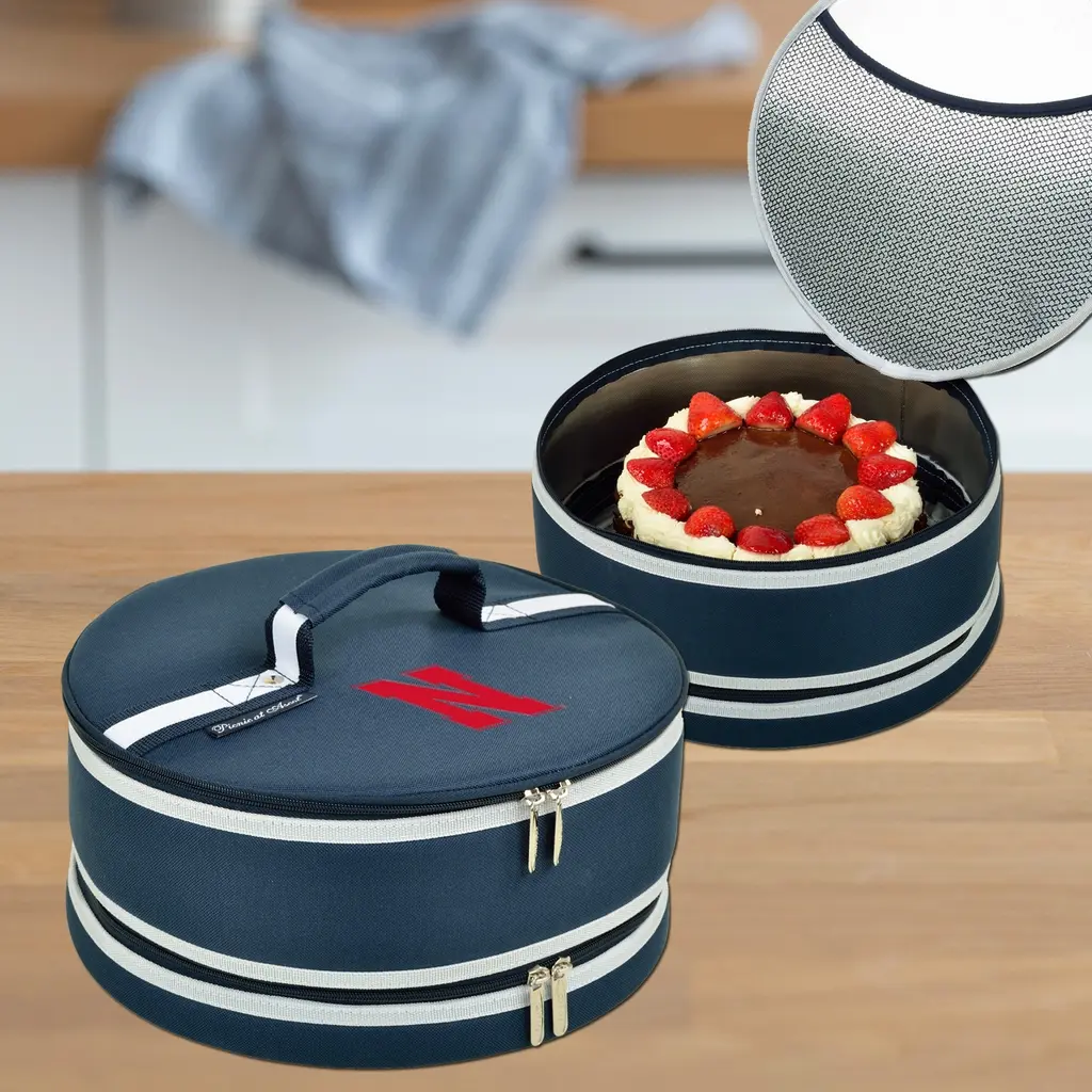 Attractive, highly versatile insulated 12" diameter carrier for cakes, cup cakes, muffins. Pies, appetizers, salads. Dual zippers top and bottom for ease of use. Rigid sides, base, and re-enforced lid assure that top of carrier never sags onto toppings. Foil lined with mesh sleeve pocket inside lid. Safely transports food for tailgating or parties. Dimensions - 12" W x 12" D x 5.75" H High quality pie and cake carrier with zippers top and bottom making it very easy to load and unload cakes and pies into the carrier Great for cakes, cup cakes, pies, appetizers or salads Made with rugged 600 denier polyester canvas with an easy to use top handle Rigid sides, base, and re-enforced lid Designed by Picnic At Ascot in USA - Lifetime Warranty 600D Polycanvas Spot Clean and Air Dry Imported