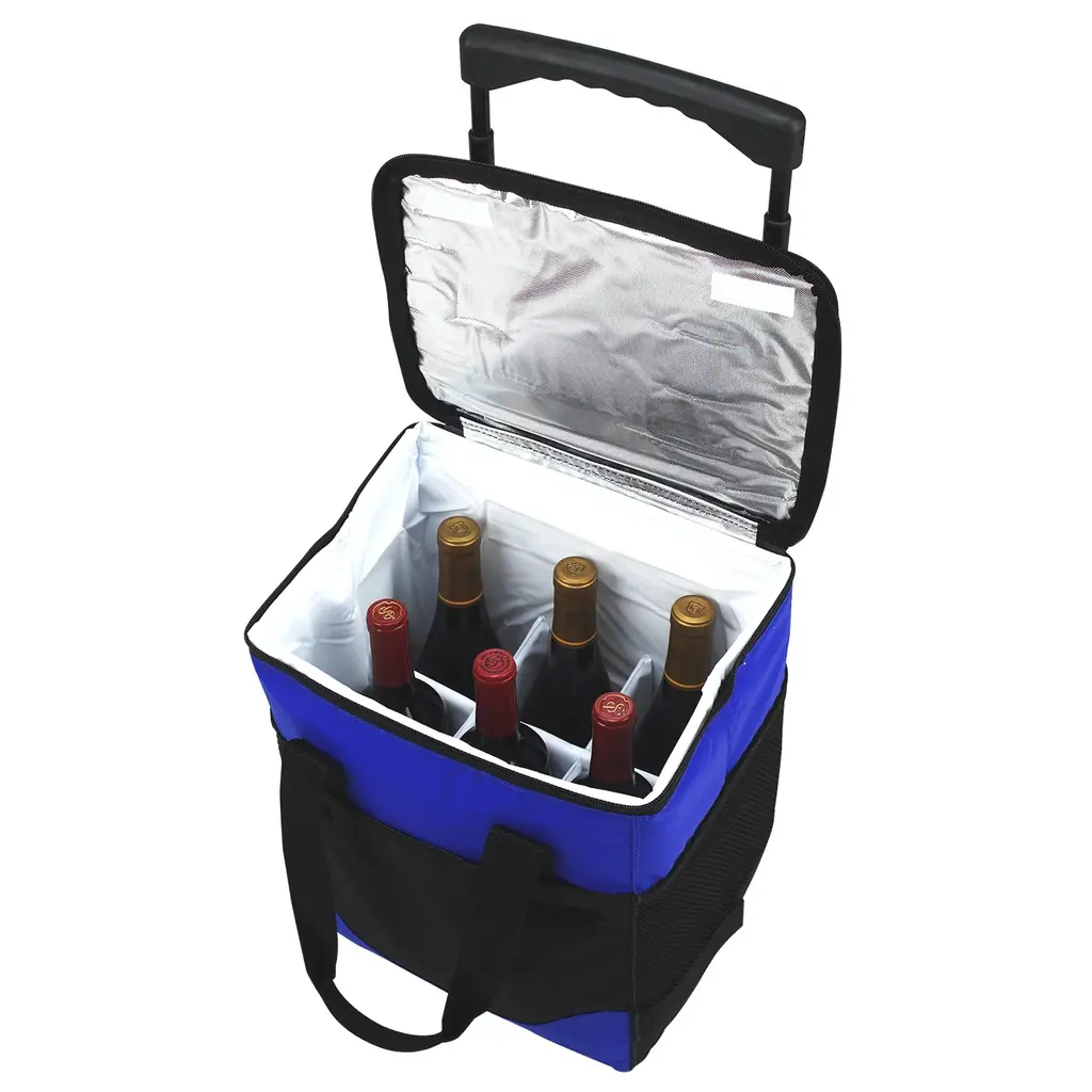 Collapsible cooler on wheels with removable 6 bottle divider. Insulated, waterproof thermal shield cooler compartment - 32 can capacity. Telescopic steel handle with durable wheels. Great for tailgating and picnicking. Hook and loop straps enable cooler to fold flat for storage. Designed in the USA. Lifetime warranty. Cooler Dimensions - 12.5" W x 10.75" D x 17" H Six wine bottle capacity, collapsible insulated wine carrier with telescopic steel handle and easy glide wheels Imported Can be converted to a general purpose 32 can cooler for food and drinks by removing the 6 bottle divider Great for picnics - concerts - parks - beach- tailgating - boating - fishing Designed by Picnic At Ascot in the USA - Lifetime Warranty 600D Polycanvas Spot Clean, Air Dry