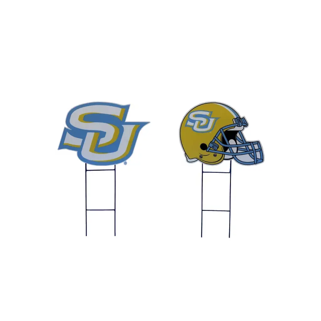 Show off your team spirit with this Pegasus Sports Logo and Helmet 2 Pack Yard Sign Set! Featuring a bold team helmet design and a separate team logo sign, this set is perfect for decorating your yard, tailgate space, or any outdoor area. Made from durable, weather-resistant materials and easy to install with included stakes, these signs let you celebrate your favorite team in style—rain or shine!