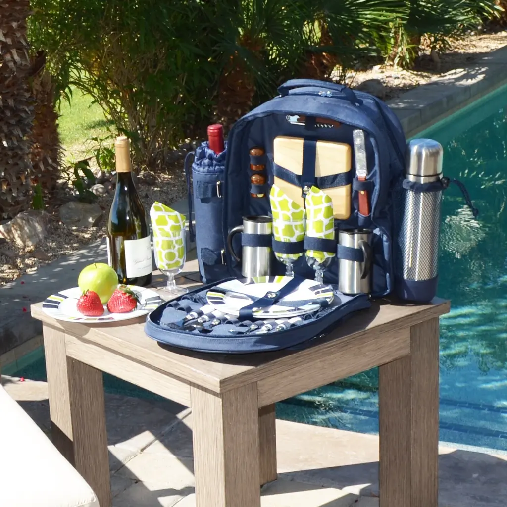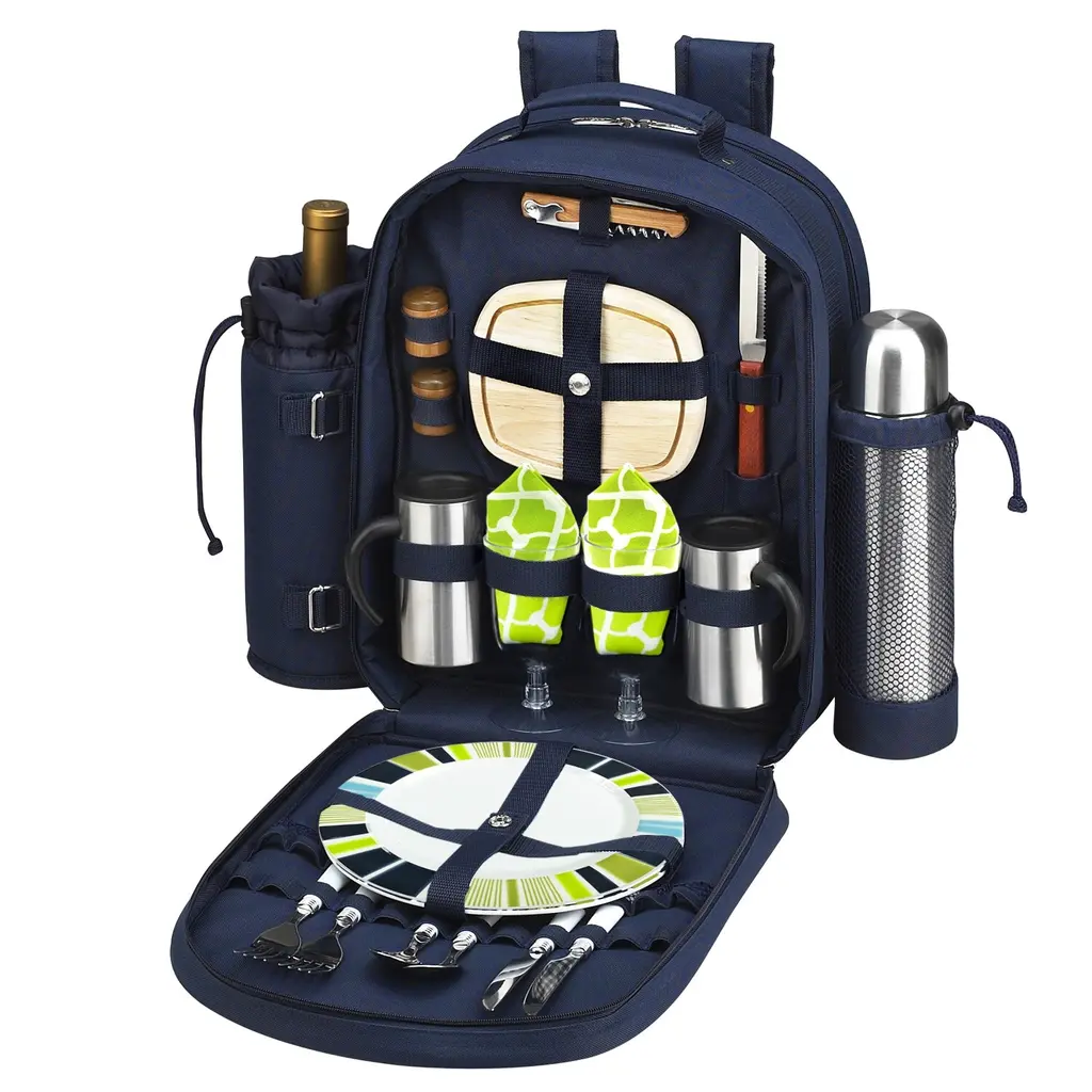 Picnic-coffee backpack for 2 features an insulated wine holder, thermal shield insulated cooler section with leak proof liner, to keep food and drink at the perfect temperature. Includes combination corkscrew, hardwood cutting board, cheese knife, wooden salt and pepper shakers, non spill tops, acrylic wine glasses, coffee mugs. Backpack Dimensions - 15.5" H x 16" W x 6.5" D High quality fully equipped insulated picnic backpack for 2 constructed with a rugged 600 denier canvas - great for trips to the park - outdoor concerts - beach and hiking Includes combination corkscrew, hardwood cutting board, cheese knife, wooden salt and pepper shakers, non spill tops, acrylic wine glasses, coffee mugs, coffee flask, 9" melamine plates, stainless steel flatware, napkins Cooler compartment with removable heat welded leak-proof liner keeps food at the perfect temperature for hours - an insulated wine holder and a vacuum flask are attached to the sides of backpack Adjustable padded shoulder straps - sturdy carry handle - front zippered pocket for keys, cell phones, tickets Designed by Picnic At Ascot and assembled in USA - Lifetime Warranty 600D Polycanvas Dishwasher Safe - Plates, Flatware, Flask and Glasses (Glasses Top Rack), Hand Wash and Dry Wood Accessories, Spot Clean Bag and Cooler, Machine Wash and Dry Napkins Imported
