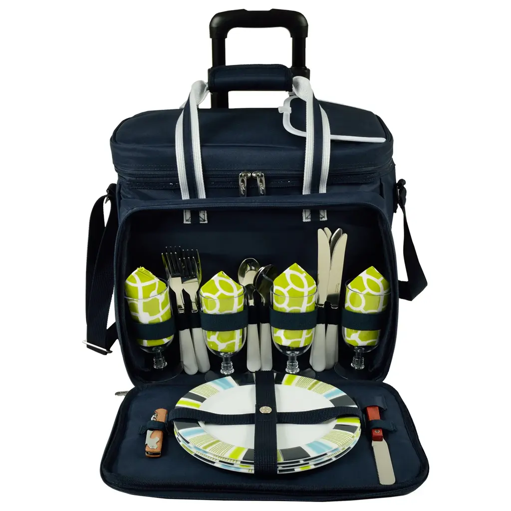 Fully equipped picnic cooler for 4 with removable wheeled cart. Unique, divided thermal shield insulated cooler with separate sections for wine and food. Divider can be detached and folded to the back when a larger cooler space is needed. Easy drinks access panel in lid. Leak proof, safe to used with ice to extend cooling. Dimensions - 14.5" W x 10.5" D x 12.5" H Deluxe fully equipped picnic cooler for 4 - great for trips to the park - outdoor concerts - sporting events - beach - camping and boating Includes coordinating 9" melamine plates and napkins - stainless steel flatware - acrylic wine glasses - cheese knife - combination corkscrew - removable wheeled cart Spacious leak-proof cooler compartment to keep food and drinks cool for hours - cooler has separate sections for food and 2 bottles - features a pass through opening in the lid for bottles Adjustable shoulder strap and carry handles - constructed with a 600 denier polyester canvas for long life Designed by Picnic At Ascot and assembled in USA - Lifetime Warranty 600D Polycanvas Dishwasher Safe - Plates, Flatware, Glasses (Glasses Top Rack), Hand Wash and Dry Wood Accessories, Spot Clean Bag and Cooler, Machine Wash and Dry Napkins Imported