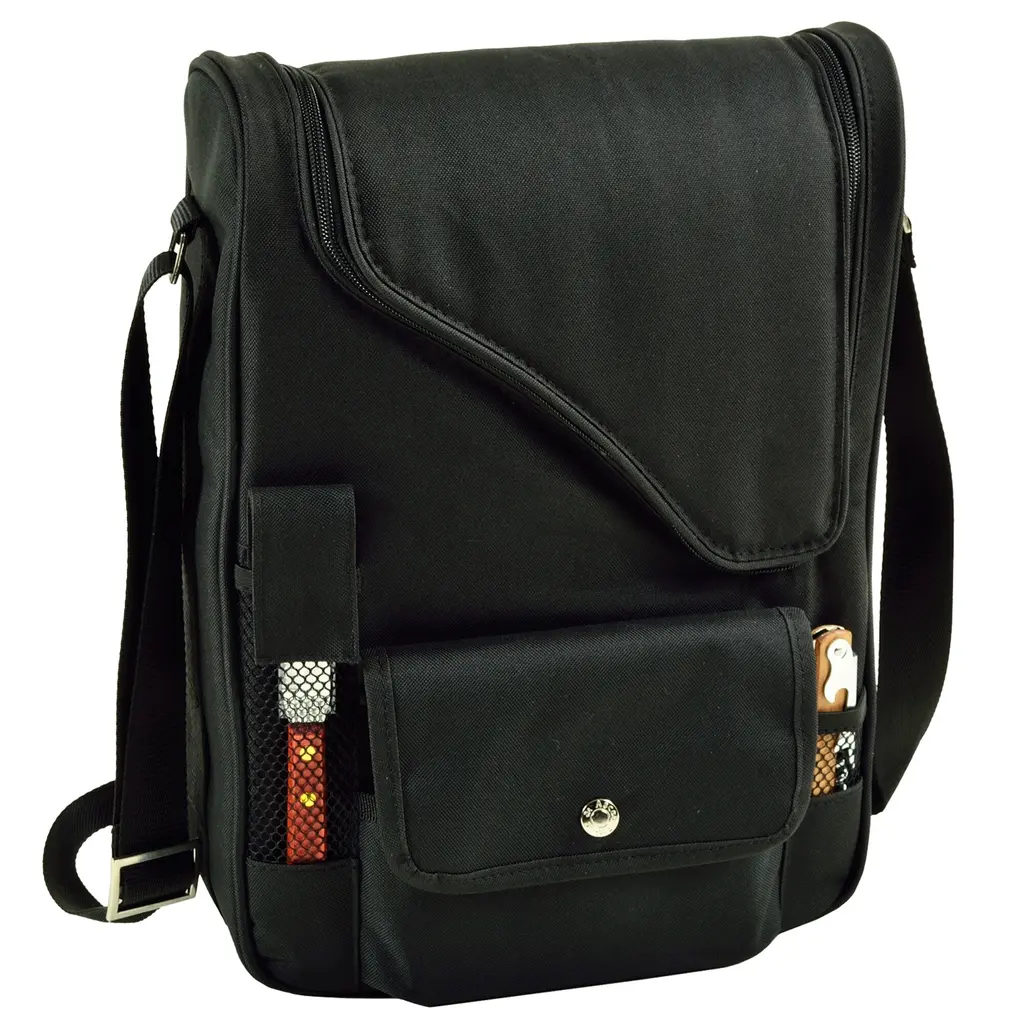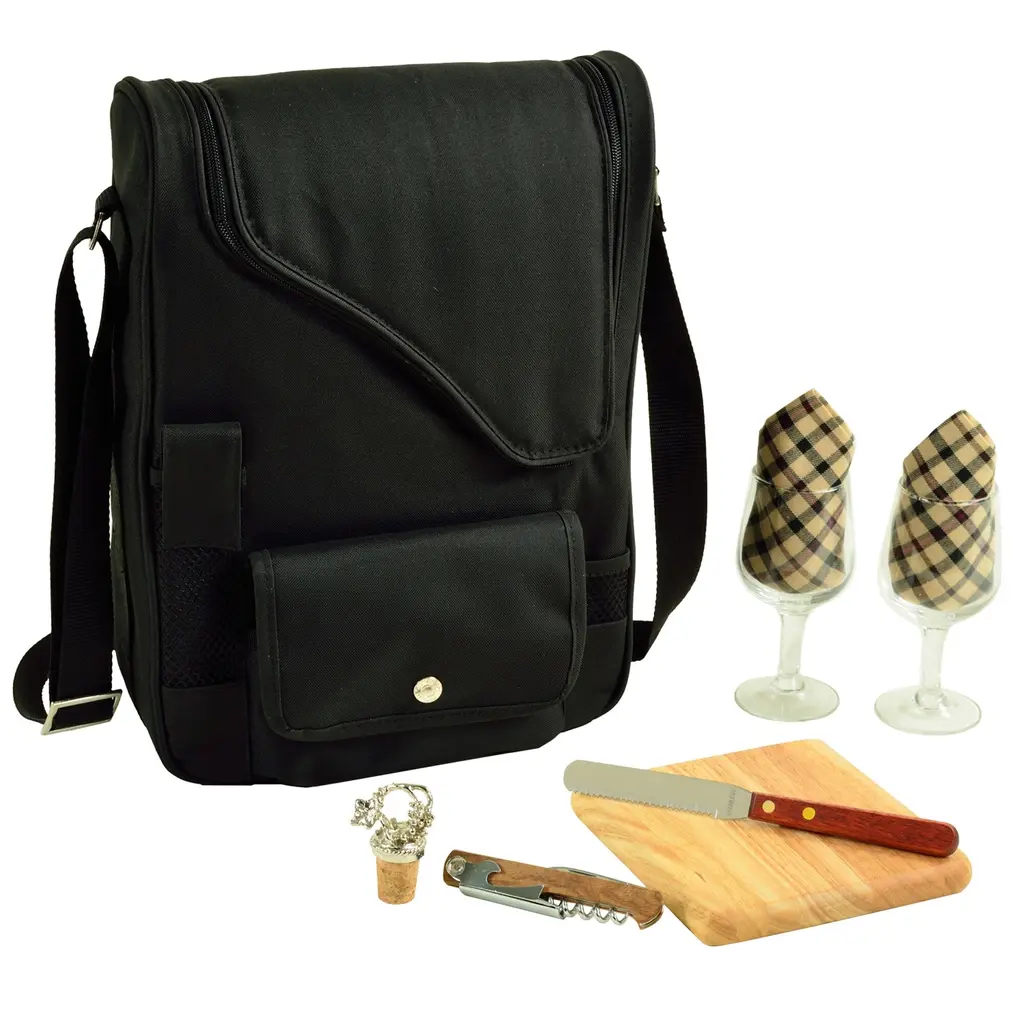 Bordeaux wine and cheese cooler with thermal shield insulation is a creatively designed carrier. This unique set holds 2 bottles and can be used as a 3 bottle carrier with glasses removed. Includes adjustable padded bottle dividers and padded divider between glasses for protection. Dimensions - 13.75" H x 10.5" W x 4" D Sleek and sophisticated wine and cheese tote - insulated to keep two bottles of wine or champagne at the perfect temperature - great for picnics - concerts - beach Includes 2 glass wine glasses - napkins - corkscrew - bottle stopper - cheese knife - hardwood cutting board Constructed with rugged 600 denier canvas and high density thermal insulation - adjustable shoulder strap Padded center dividers to keep wine bottles from clanking - adjustable to accommodate snacks or a third bottle if the glasses are removed, padded divider between glasses Designed by Picnic At Ascot and assembled in the USA - Lifetime Warranty 600D Polycanvas Spot Clean, Air Dry Case, Dishwasher Safe Glasses, Machine Wash and Dry Napkins, Hand Wash and Dry Corkscrew, Cheese Board and Knife Imported