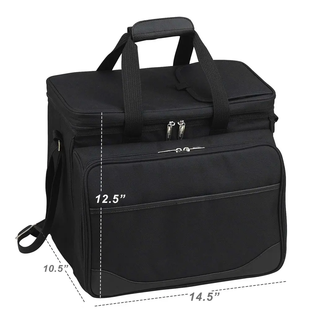 Fully Equipped Deluxe Picnic Cooler for 4 - Great for Trips to the Park - Outdoor Concerts - Sporting Events - Beach - Camping & Boating Includes matching 9-inch melamine plates and napkins, stainless steel flatware, acrylic wine glasses, cheese knife, and matching corkscrew Large leak-proof compartment to keep food and drinks fresh for hours. The cooler has separate sections for food and 2 bottles. Features a pass-through opening in the lid for bottles Adjustable shoulder strap and carry handles, made from 600 denier polyester canvas for long life, measures 14.5" W x 10.5" D x 12.5" H Designed by Picnic at Ascot and assembled in the USA