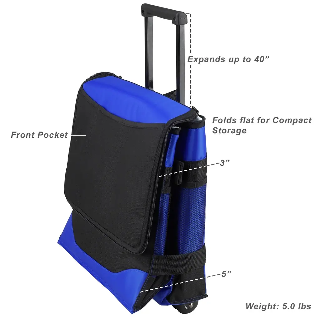 Collapsible 60 can capacity cooler on wheels with large insulated, waterproof, thermal shield cooler compartment. Side carry handles for easy of use. Telescopic steel handle with durable wheels. Hook and loop straps enable cooler to fold flat for storage. Great for tailgating and picnicking. Designed in the USA. Lifetime warranty. Cooler Dimensions - 15.75" W x 13.75" D x 14" H 60 can capacity, collapsible cooler with telescopic steel handle and easy glide wheels Constructed with rugged 600 denier polyester canvas with high density thermal insulation - heat welded leak-proof easy clean lining Cooler folds flat for storage when not in use Great for picnics - concerts - parks - beach- tailgating - boating - fishing Designed by Picnic At Ascot in the USA - Lifetime Warranty 600D Polycanvas Spot Clean, Air Dry Imported