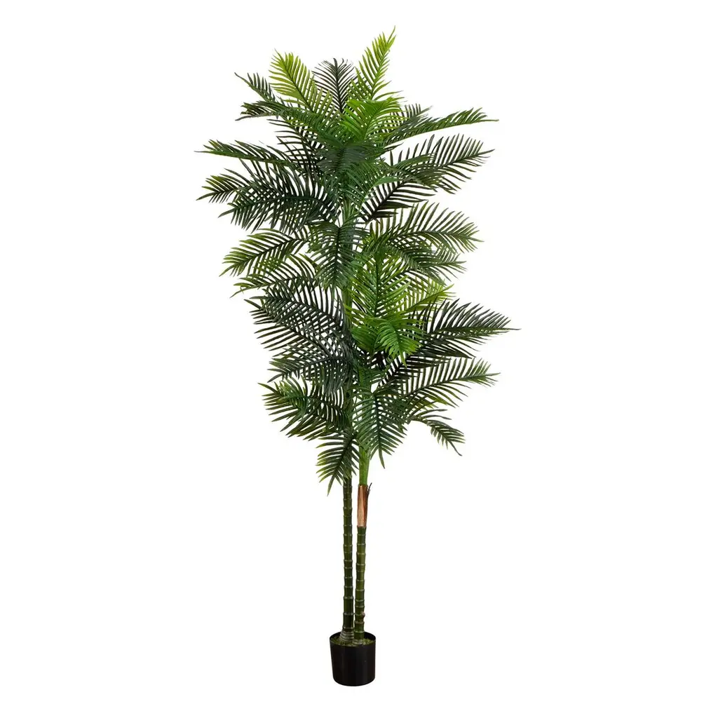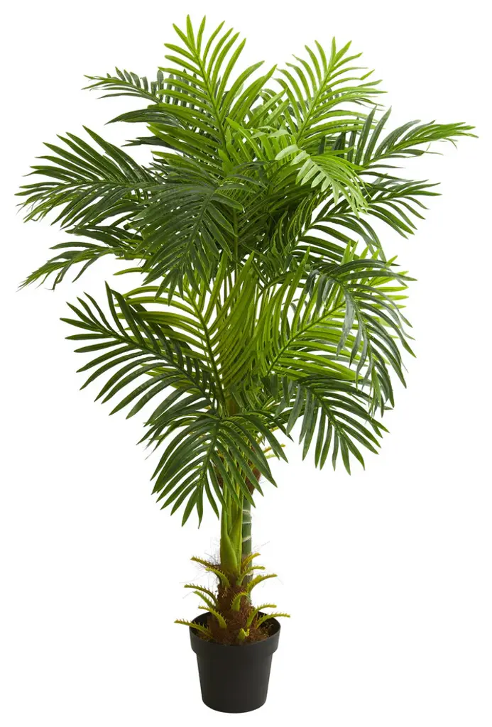 This artificial triple areca palm tree has three palm trunks rising out at different heights and extending into full, realistic looking foliage. With smooth leaves and hues of a dark, rich green, this 5.5-foot piece will not only add a pop of color, it will draw the eye and make you feel like you''ve stepped outdoors, if only for a moment.