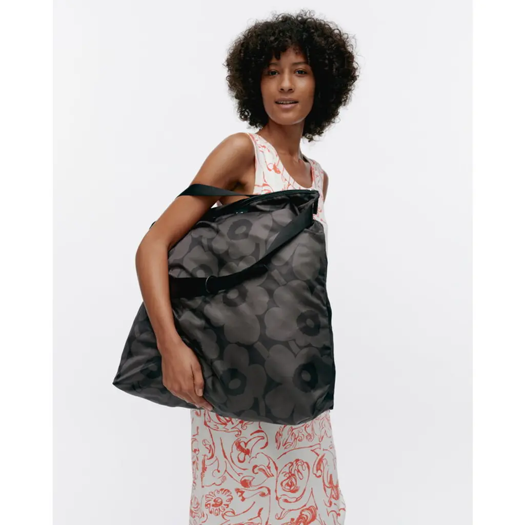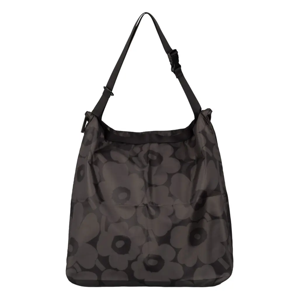 Marimekko's Neat Crossbody Unikko shoulder bag is adorned with the iconic floral print by Maija Isola. Made from recycled polyester, the large bag features a zip closure, an adjustable strap crafted from recycled polyamide, and a bold Marimekko logo label on the front. The crossbody bag also includes a small interior pocket where the entire bag can be folded for easy storage – a compact and practical choice for travel or everyday use! The Unikko pattern came about in 1964 after Armi Ratia, the founder of Marimekko, had announced in public that no floral fabrics are designed at Marimekko. Maija Isola did not accept rules or restrictions and designed, in protest, a complete collection of bold floral patterns: Unikko, a Finnish word that means poppy. Today, Unikko is one of Marimekko's best-known patterns and is recognized worldwide.