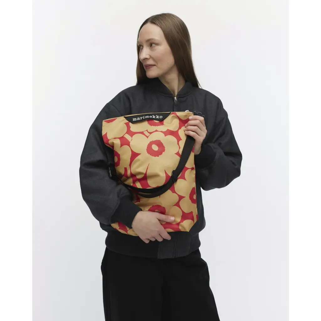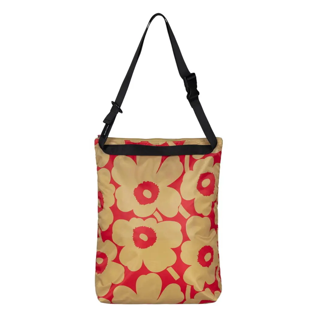 Marimekko's Neat Crossbody Unikko shoulder bag is adorned with the iconic floral print by Maija Isola in stylish brown and red tones. Made from recycled polyester, the medium-sized bag features a zip closure, an adjustable strap crafted from recycled polyamide, and a bold Marimekko logo label on the front. The crossbody bag also includes a small interior pocket where the entire bag can be folded for easy storage – a compact and practical choice for travel or everyday use! The Unikko pattern came about in 1964 after Armi Ratia, the founder of Marimekko, had announced in public that no floral fabrics would be designed at Marimekko. Maija Isola did not accept rules or restrictions and designed, in protest, a complete collection of bold floral patterns: Unikko, a Finnish word that means poppy. Today, Unikko is one of Marimekko's best-known patterns and is recognized worldwide.