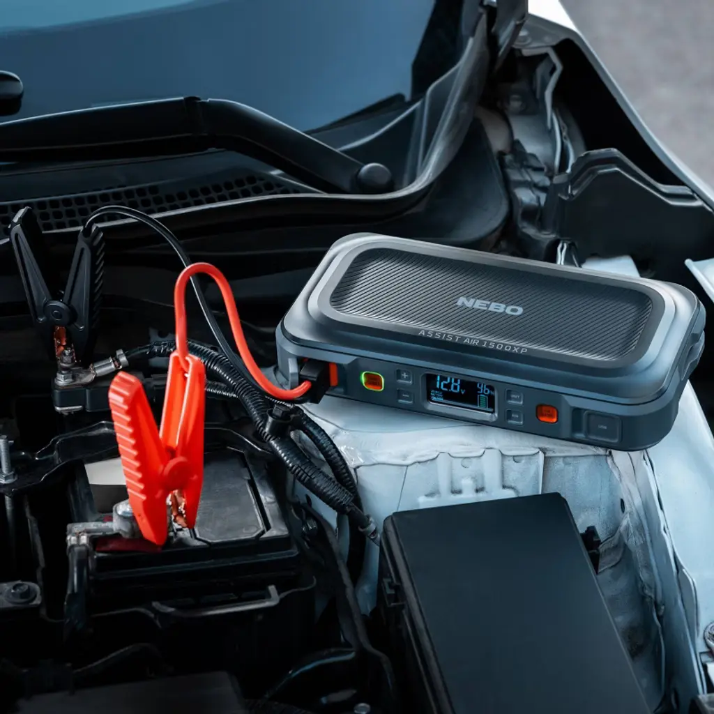 The inconvenience of a dead car battery or a flat tire is always an unwelcomed surprise and jump starting a vehicle can be intimidating. Take charge of any roadside emergency with the NEBO Assist™ Air 1500XP Jump Starter. With 1500 peak amps, you can confidently jump start any 12-volt car, Truck, or SUV battery. The simple 3-step jump start process is conveniently printed on the microfiber storage bag, so you can independently jump start your vehicle without calling for help. Patented safety technology ensures the jumper cables are always spark-proof while being handled, and the battery is built with the latest in smart battery protections. It performs a comprehensive safety check before every jump start to ensure you won't cause harm to yourself or your vehicle. In addition to keeping your car running, the Assist Air's integrated air compressor is the easiest way to pump up a flat tire. No more guessing or trying to read a small pressure gauge while inflating your tire, simply set the exact recommended PSI for your tire and let it run. The Assist Air will automatically shut off when your ideal pressure is reached. And, if you do need more help in an emergency, make sure your phone has a charge with the 44.4Wh power bank. This 4-in-1 design can jump start your vehicle, inflate your tires, charge USB-powered devices, and features an integrated floodlight so you’re better prepared for emergency roadside situations or power outages.