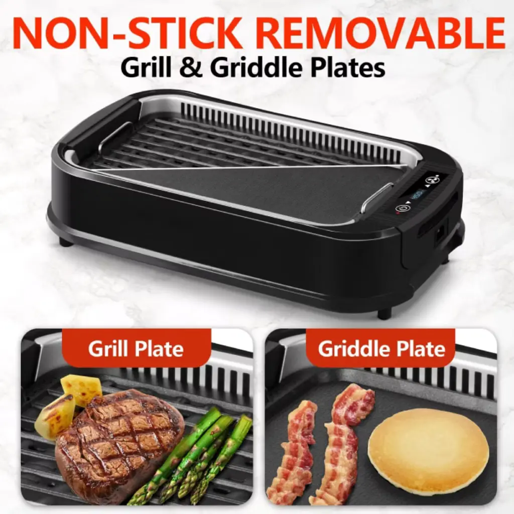 Just switch the top grill/griddle plate as you like. This electric grill griddle provides you the possibility to finish your whole-day meals on one device, saving you the extra cost of buying another device! The glass lid also speeds up food cooking, retains heat, and allows you to conveniently see your food.You can grill almost anything on this grill. With the double U heating tubes providing fast and stable heating for the barbecue rack, you can enjoy delicious barbecue in a few minutes. The perforated grill plate filters out excess oil and leaves the meat with grill marks like a charcoal grill. The griddle plate is perfect for grilling breakfast bacon, eggs, pancakes, and more. Anything you would grill outside, you can grill indoors!This smokeless electric grill is ideal for indoor grilling, especially in small confined spaces like city apartments. It eliminates cloudy smoke and saves you from battling outdoor grilling in storms or dealing with smoke trapped under patio umbrellas. Enjoy barbecue at home without the hassle of going outside!The ultra-clear LED smart display helps you adjust the temperature from 200¨H to 450¨H. Much like an oven, these controls make cooking a variety of foods easy and efficient. The non-stick coating on the heating plate ensures food can be taken out easily without residue. Multiple detachable parts make cleaning easier, and it is dishwasher safe, saving you the hassle of kitchen cleanup. Product Dimensions: 20.08 x 13.19 x 7.68 inches Weight: 17.9 pounds