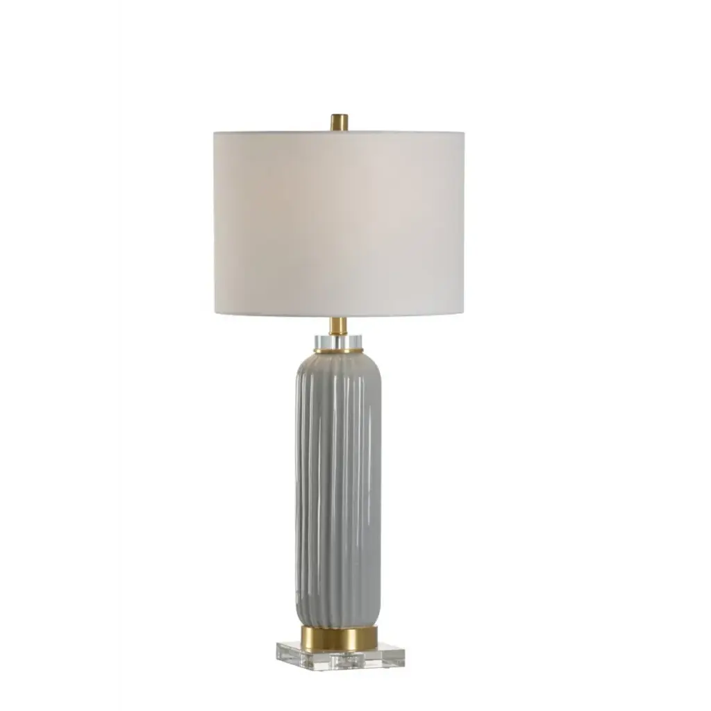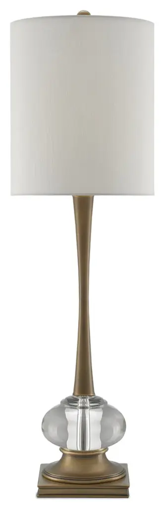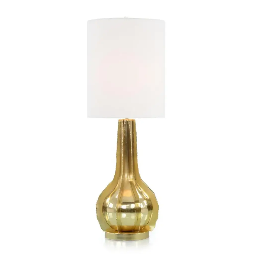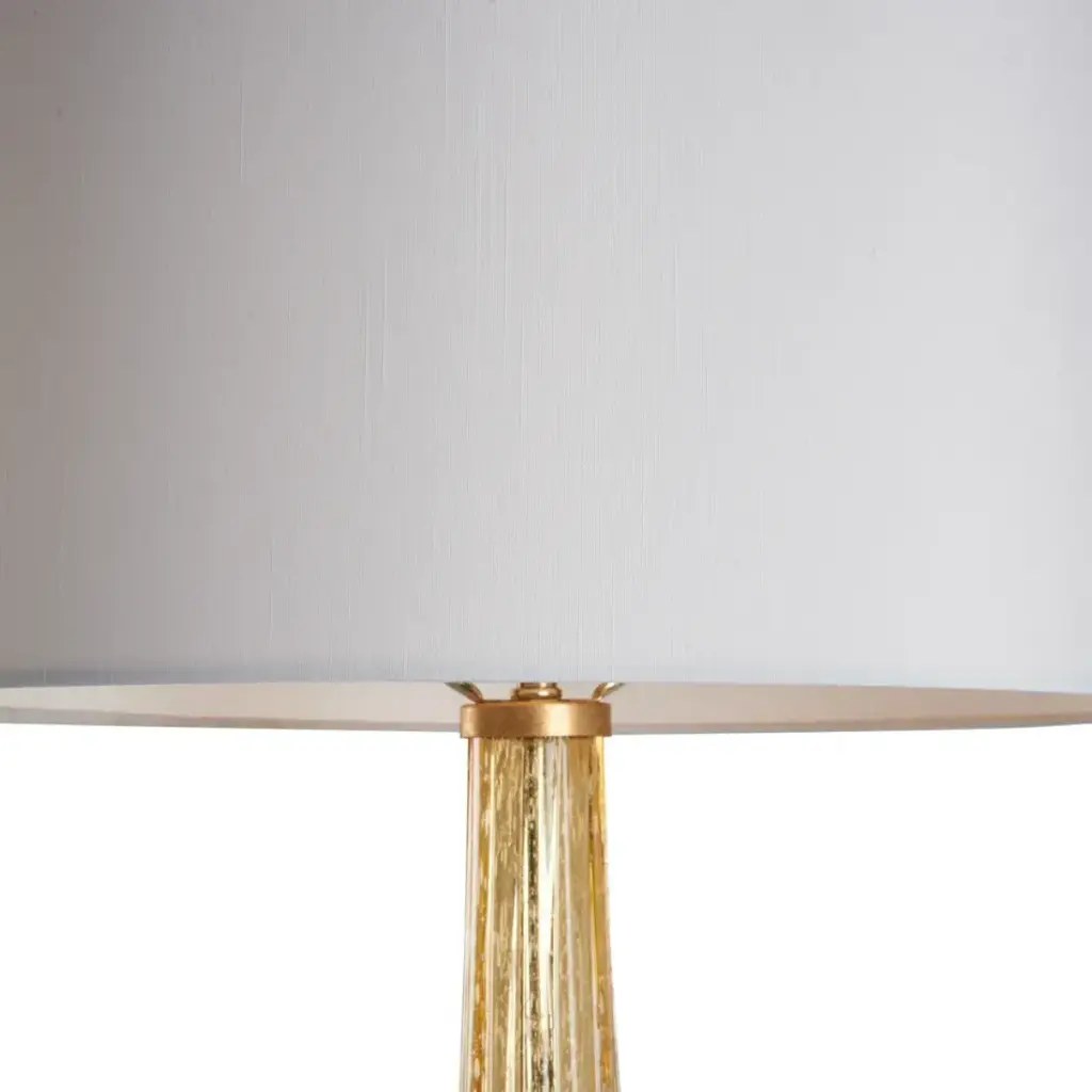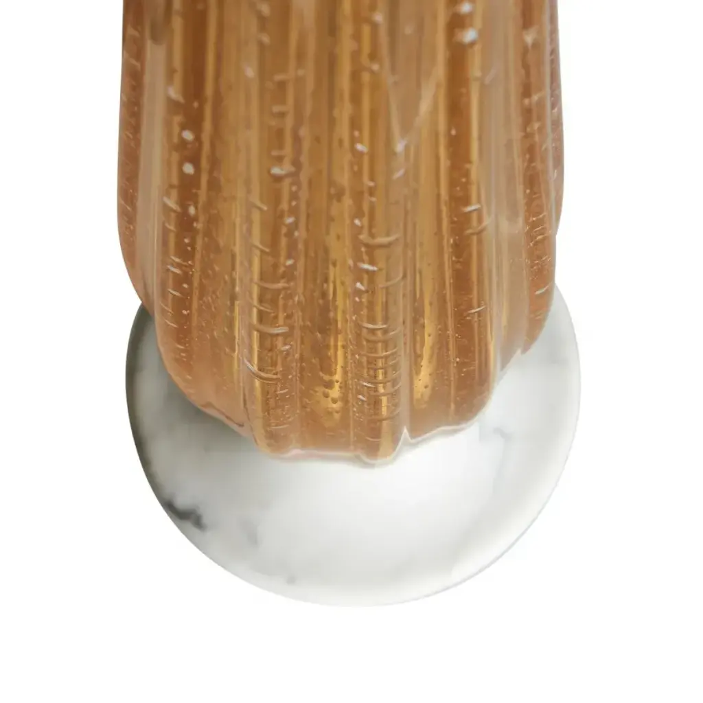 This tall lamp features a gold glass body with subtle speckles, adding a touch of shimmer and elegance. A solid marble base grounds the design with timeless sophistication.