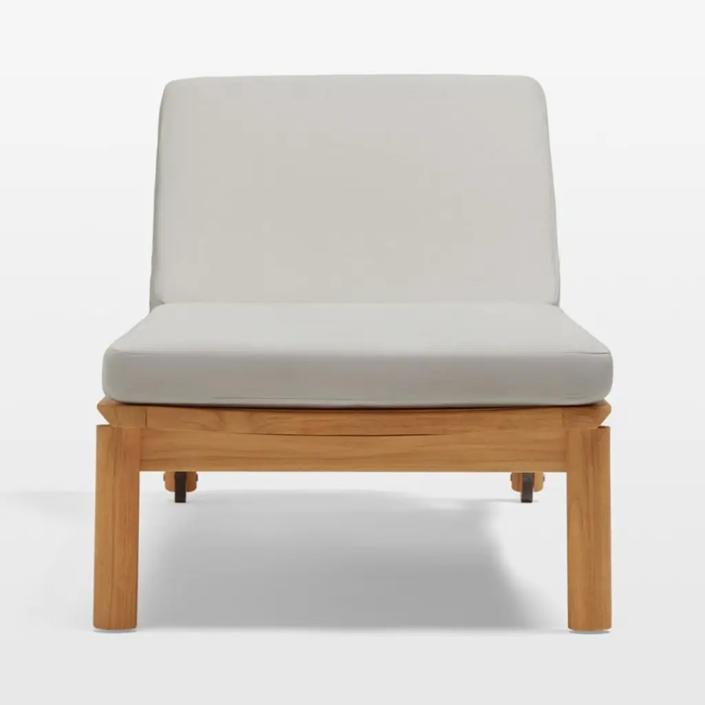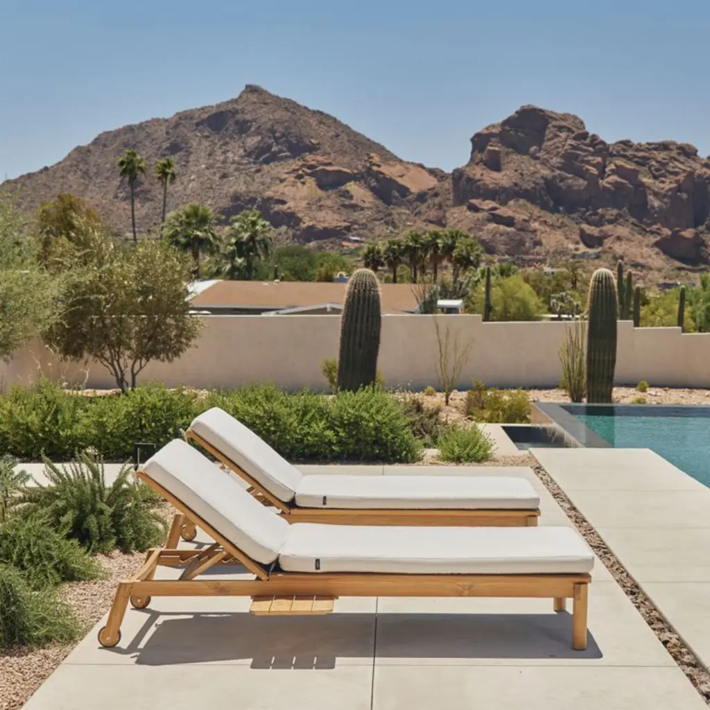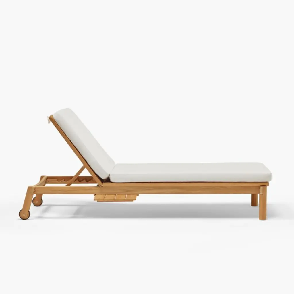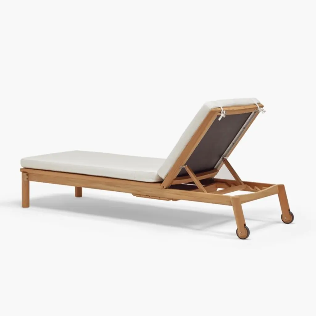 Angled at a slight recline, the chaise lounge invites you to kick back and enjoy the great outdoors. Natural teak shapes the chaise's chunky, rounded frame that features an adjustable back with five reclining positions and a side table surface that slides out on either side. The cushion adds a layer of comfort in a light neutral shade, and wheels make it easy to move the chaise into sun or shade. Offering living-room looks with surprising durability, the outdoor chaise lounge withstands the elements in weather-resistant teak with a fast-drying foam cushion.Based in Phoenix, Neighbor crafts beautiful, durable furniture for outdoor living with premium materials such as Sunbrella fabrics and FSC®-certified teak. We're thrilled to partner with Neighbor in bringing you Haven, one of the company's first collections designed to build connection and expand livable square footage to outdoor spaces.By choosing FSC®-certified furniture, you are supporting responsible management of the world's forests.