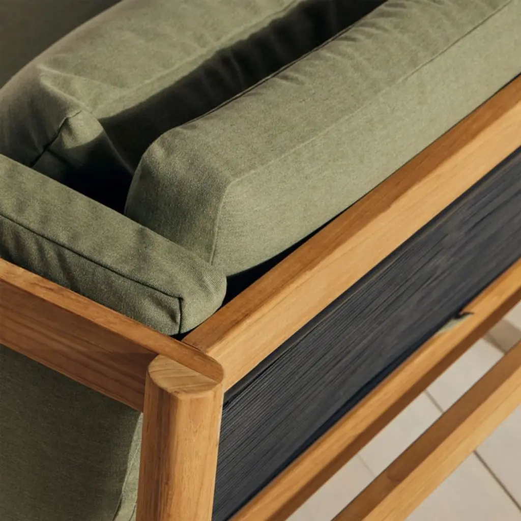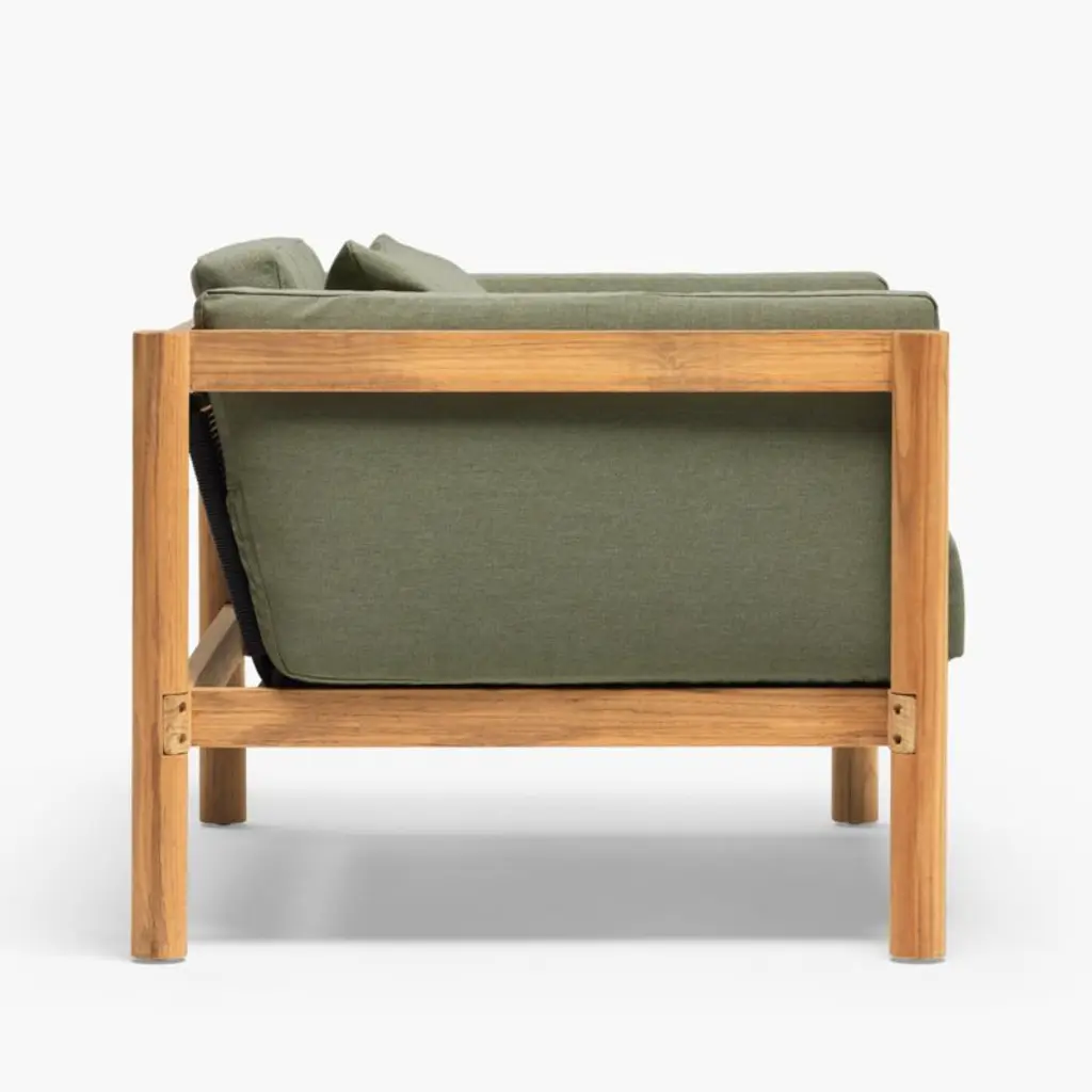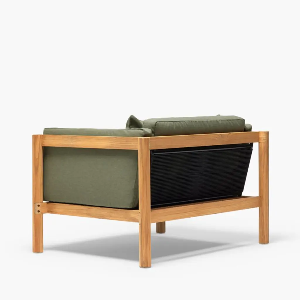 Angled at a slight recline, this deep-seated chair and a half invites you and a friend to kick back and enjoy the great outdoors. Boxy seat and back cushions upholstered in leafy green are curl-up comfy, while the chair's slim side bolsters add a soft layer for draping arms. Natural teak shapes the chunky, rounded frame complemented by a hand-stretched polyester rope back. Offering living-room looks with surprising durability, the oversized outdoor chair withstands the elements in weather-resistant teak and fast-drying foam cushions.Based in Phoenix, Neighbor crafts beautiful, durable furniture for outdoor living with premium materials such as Sunbrella fabrics and FSC®-certified teak. We're thrilled to partner with Neighbor in bringing you Haven, one of the company's first collections designed to build connection and expand livable square footage to outdoor spaces.By choosing FSC®-certified furniture, you are supporting responsible management of the world's forests.