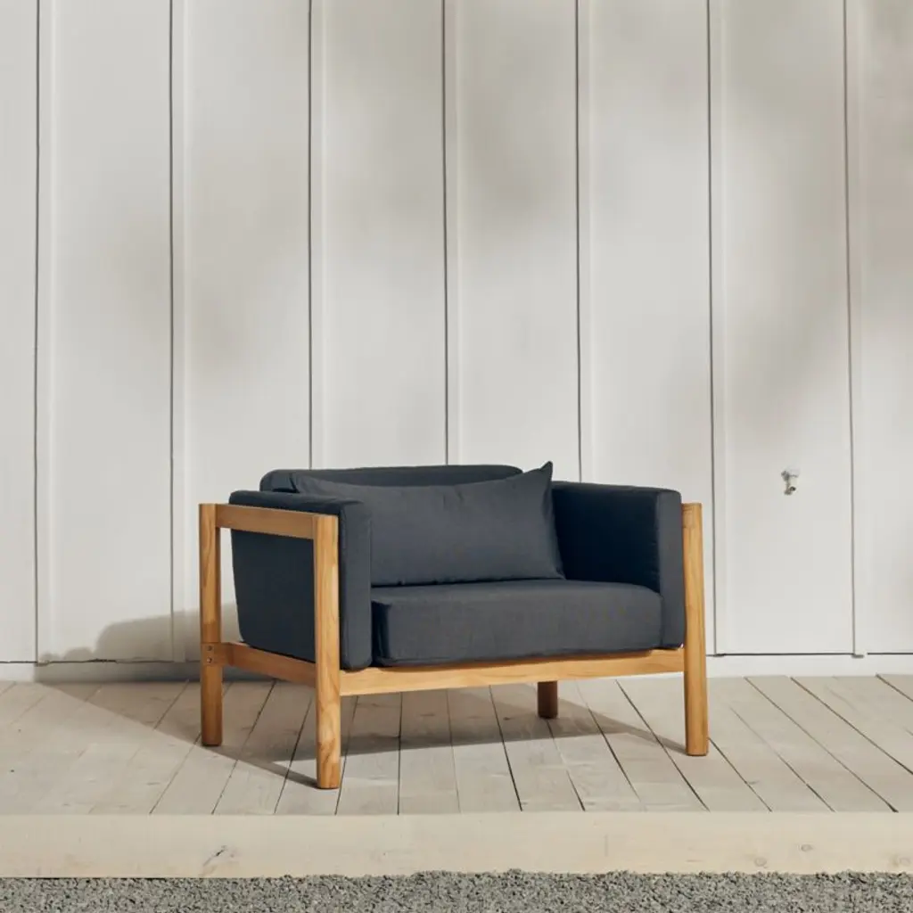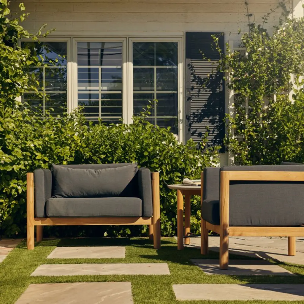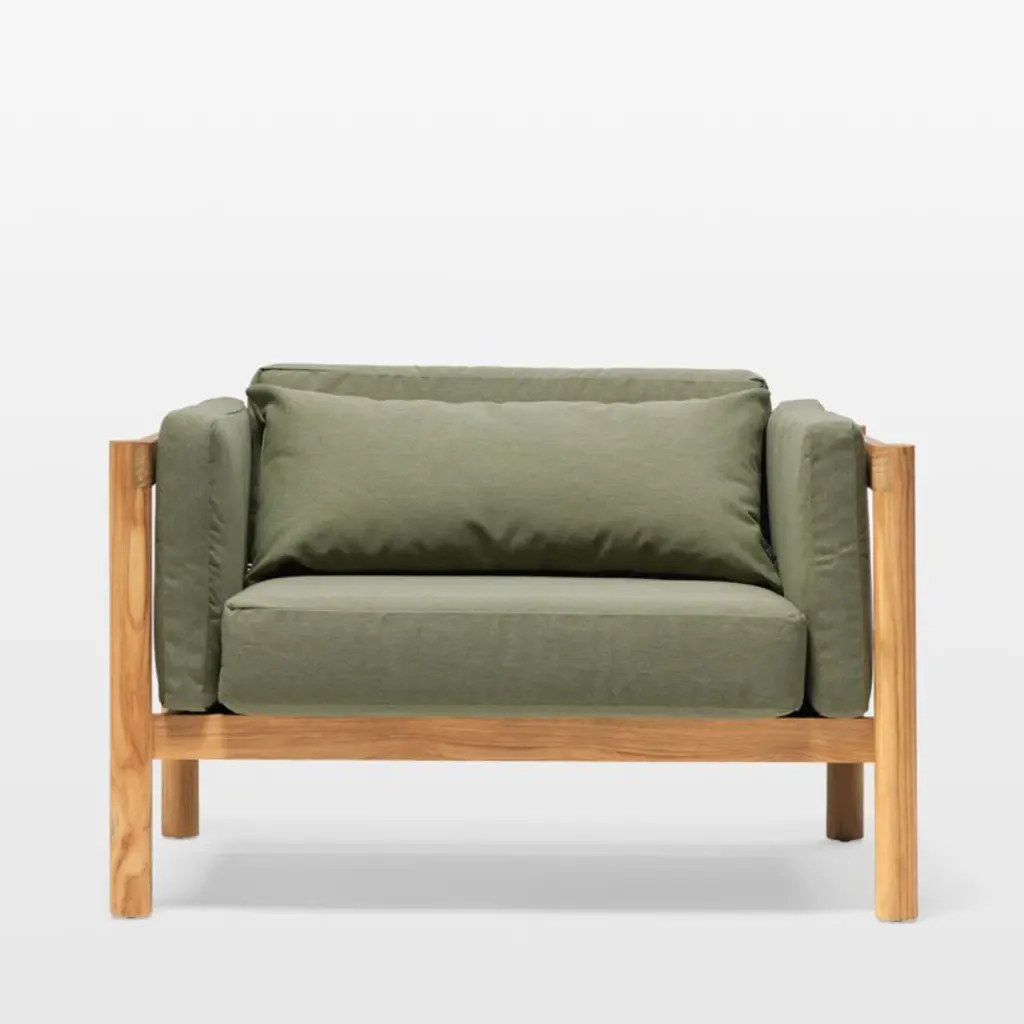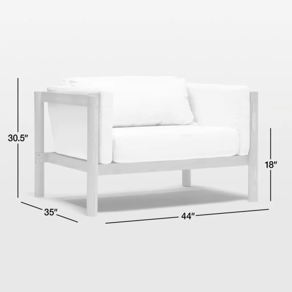 Angled at a slight recline, this deep-seated chair and a half invites you and a friend to kick back and enjoy the great outdoors. Boxy seat and back cushions upholstered in leafy green are curl-up comfy, while the chair's slim side bolsters add a soft layer for draping arms. Natural teak shapes the chunky, rounded frame complemented by a hand-stretched polyester rope back. Offering living-room looks with surprising durability, the oversized outdoor chair withstands the elements in weather-resistant teak and fast-drying foam cushions.Based in Phoenix, Neighbor crafts beautiful, durable furniture for outdoor living with premium materials such as Sunbrella fabrics and FSC®-certified teak. We're thrilled to partner with Neighbor in bringing you Haven, one of the company's first collections designed to build connection and expand livable square footage to outdoor spaces.By choosing FSC®-certified furniture, you are supporting responsible management of the world's forests.