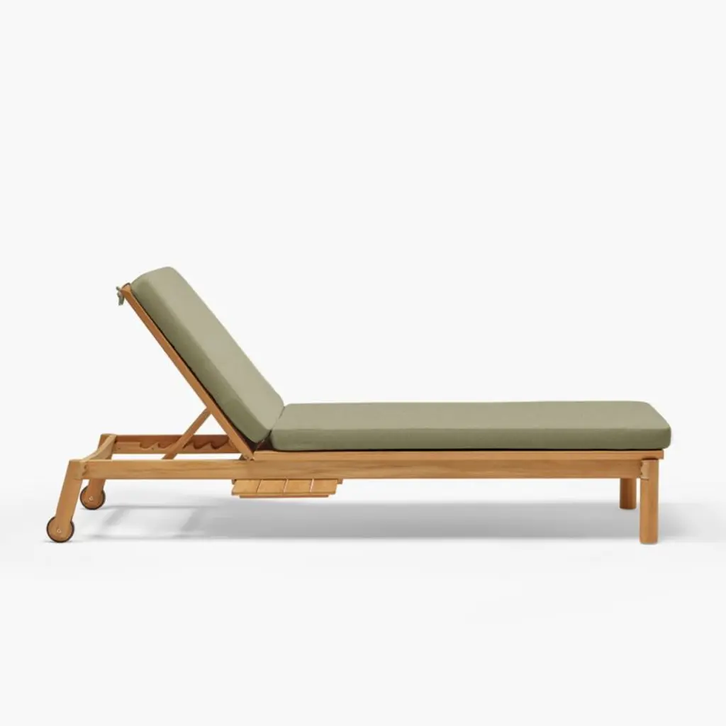 Angled at a slight recline, the chaise lounge invites you to kick back and enjoy the great outdoors. Natural teak shapes the chaise's chunky, rounded frame that features an adjustable back with five reclining positions and a side table surface that slides out on either side. The leafy green cushion adds a layer of comfort, and wheels make it easy to move the chaise into sun or shade. Offering living-room looks with surprising durability, the outdoor chaise lounge withstands the elements in weather-resistant teak with a fast-drying foam cushion.Based in Phoenix, Neighbor crafts beautiful, durable furniture for outdoor living with premium materials such as Sunbrella fabrics and FSC®-certified teak. We're thrilled to partner with Neighbor in bringing you Haven, one of the company's first collections designed to build connection and expand livable square footage to outdoor spaces.By choosing FSC®-certified furniture, you are supporting responsible management of the world's forests.