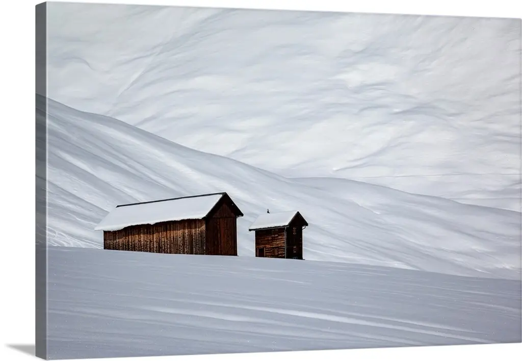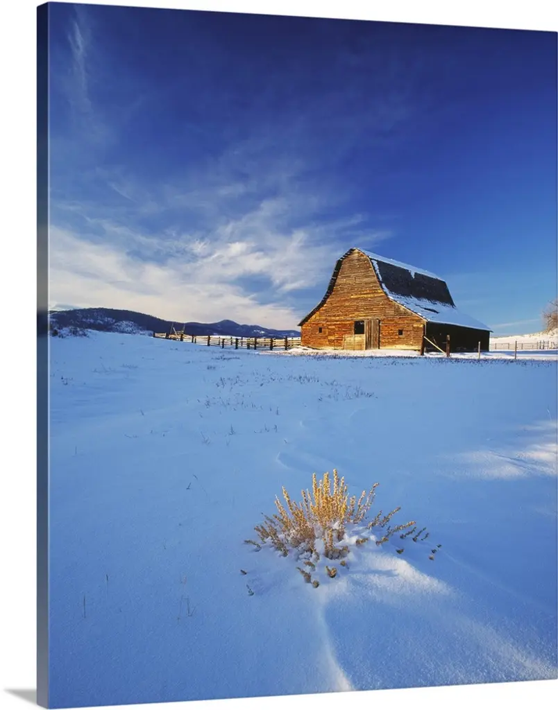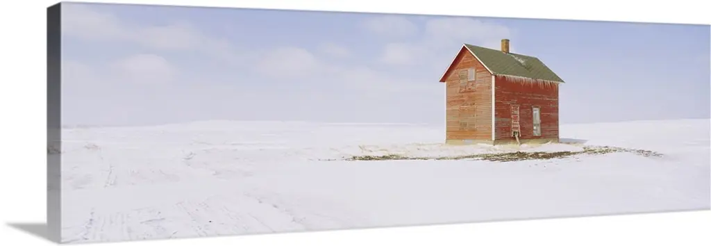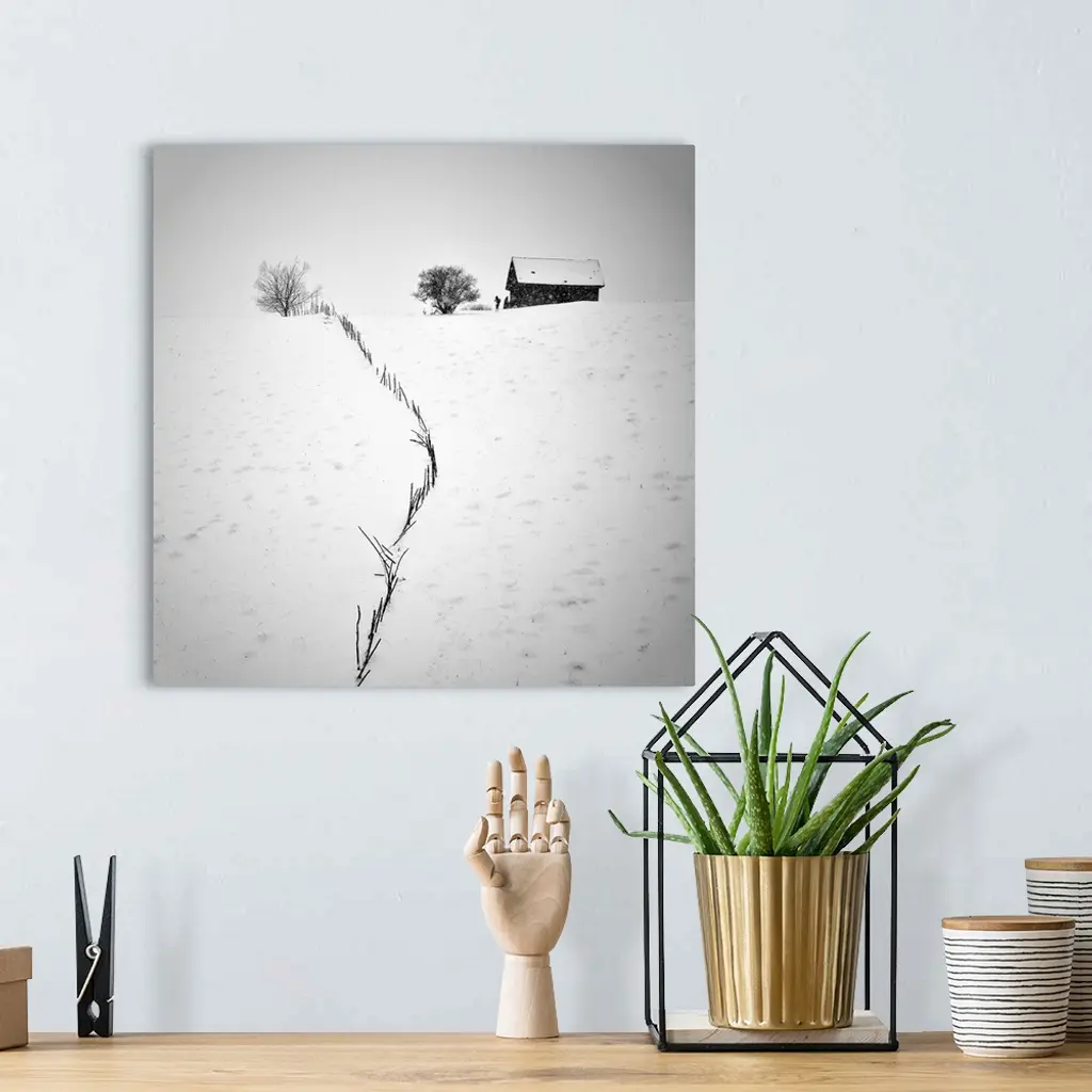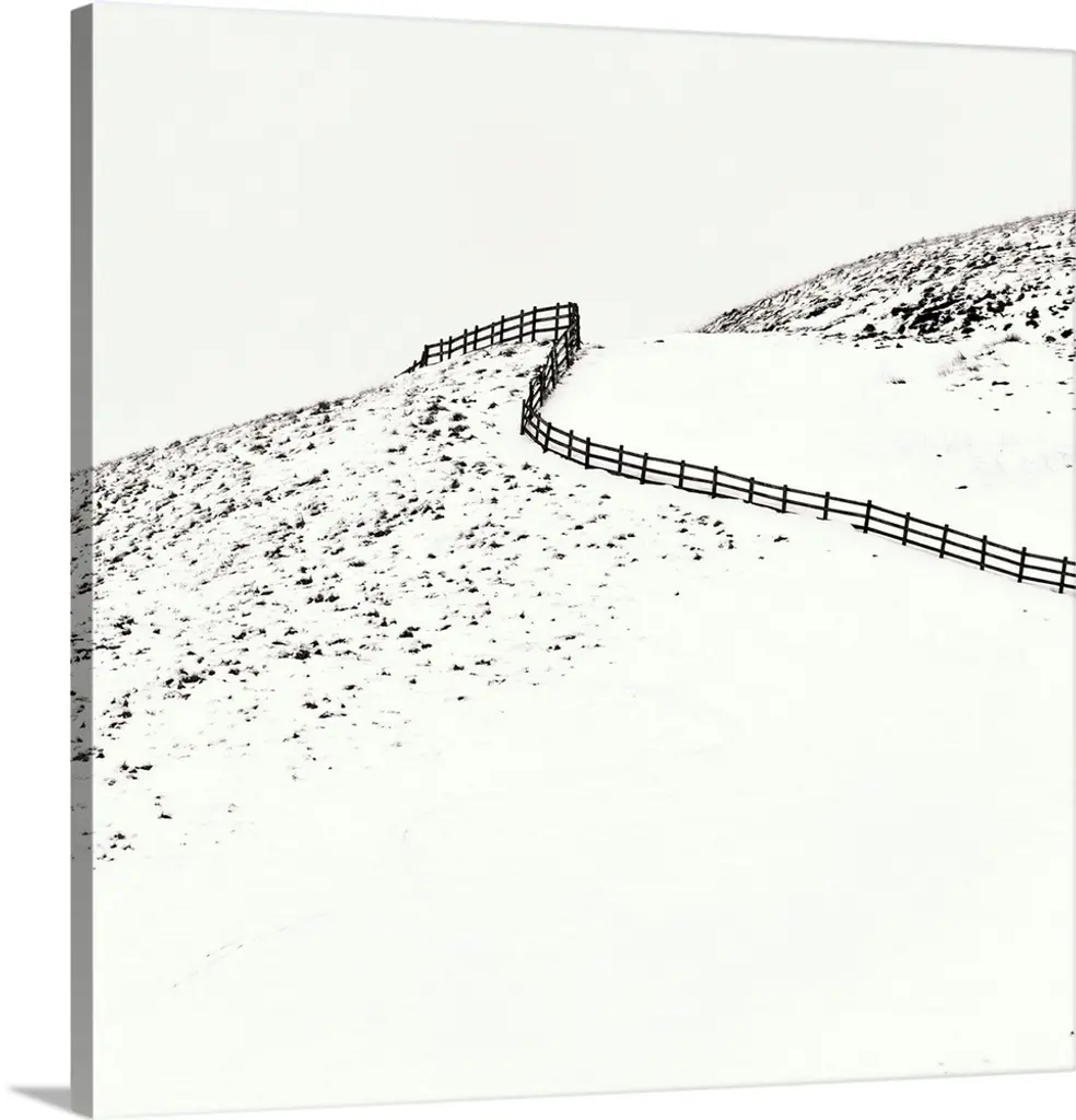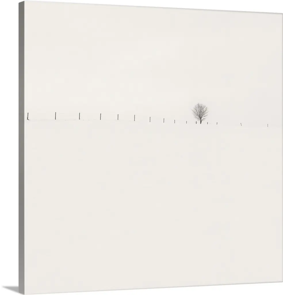 A stick fence cuts through a snowy landscape with a house and two trees on the horizon.