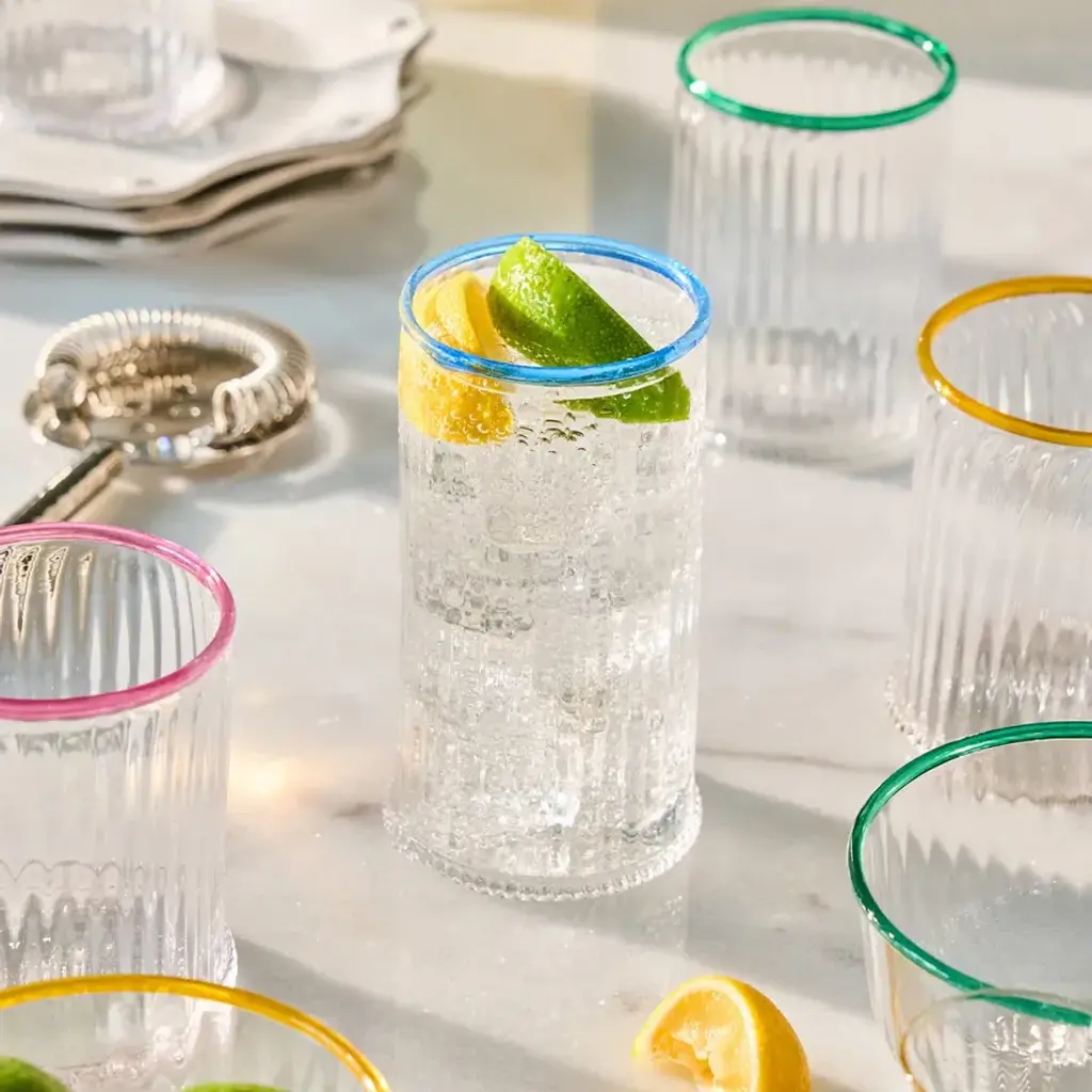 Our iconic Bohemian Glass is given a fresh and modern spin with a joyful wink of color. Chic and shimmering, each highball ripples with intricate mouth blown glass and is rimmed with a happy hue to create pure cocktail-hour eye candy for everything from lemonade to fun party drinks. Pick a pop of your favorite color or collect them all to taste the rainbow! Based in Connecticut, Juliska is committed to bringing elegant European design into our modern homes. Since its founding in 2001, when David and Capucine Gooding began by working with artisans outside of Prague to reproduce antique Bohemian glass pieces, every piece from Juliska has shared a rich heritage spanning six centuries of European design. Juliska's creations are timeless, romantic and effortlessly chic.