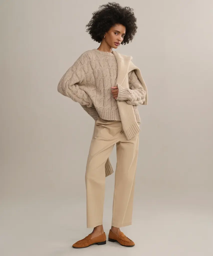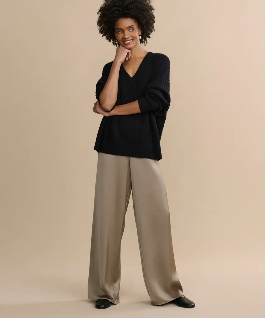 Nell V-Neck Sweater Black Our take on the classic cable knit sweater with a relaxed fit and v-neck twist. With a slouchy body and elevated feel, this sweater will be your new go-to. Pair it with trousers, denim, or even a skirt for all-season appeal.