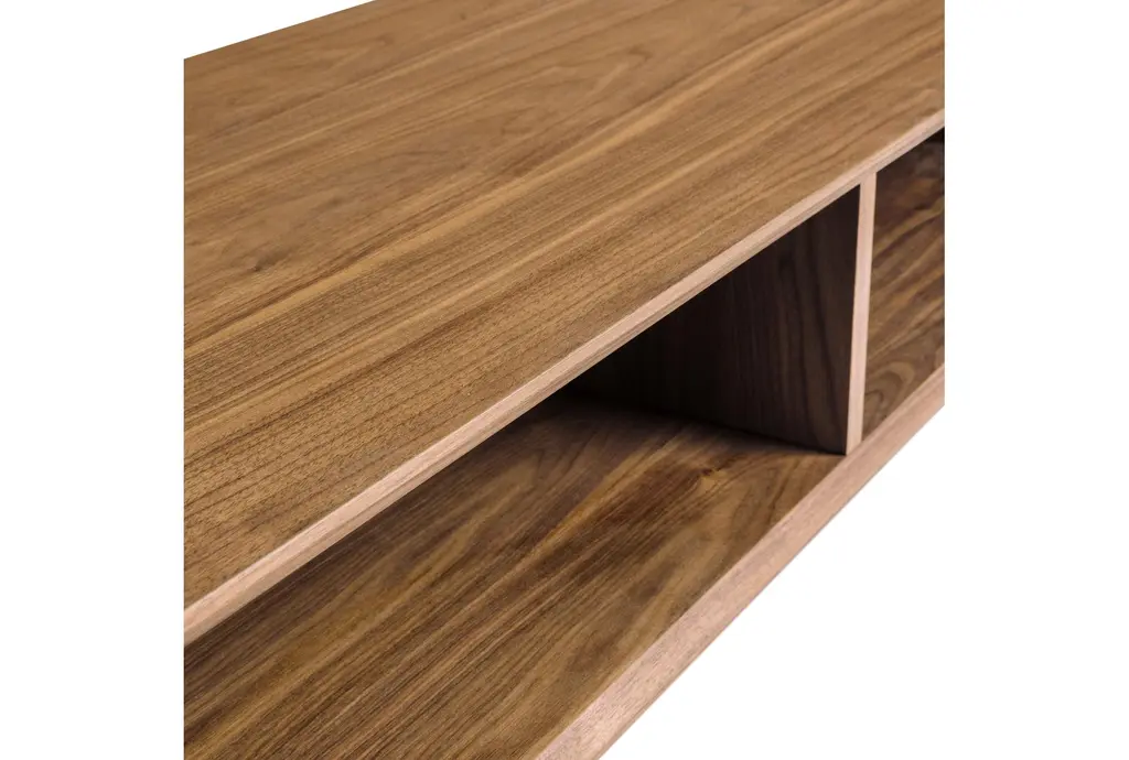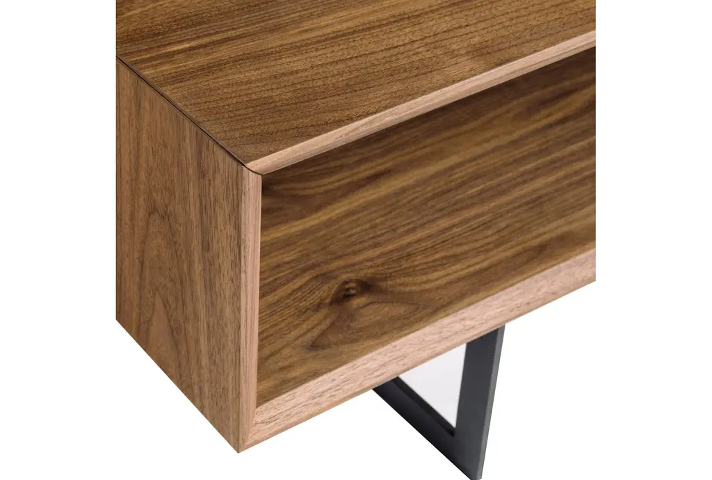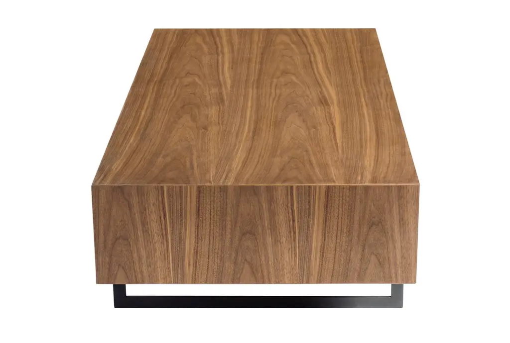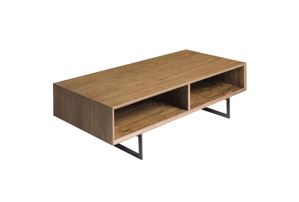 The Nelson Coffee Table With Storage is a perfect blend of modern and industrial styles, featuring a sleek walnut finish. Crafted from American walnut veneer over MDF, this rectangular coffee table offers both aesthetic appeal and practical storage solutions with its two compartments. The matte black square steel base adds a touch of industrial charm, making it a versatile addition to any living space. Shop coffee tables like this one and find the perfect design for your space.
