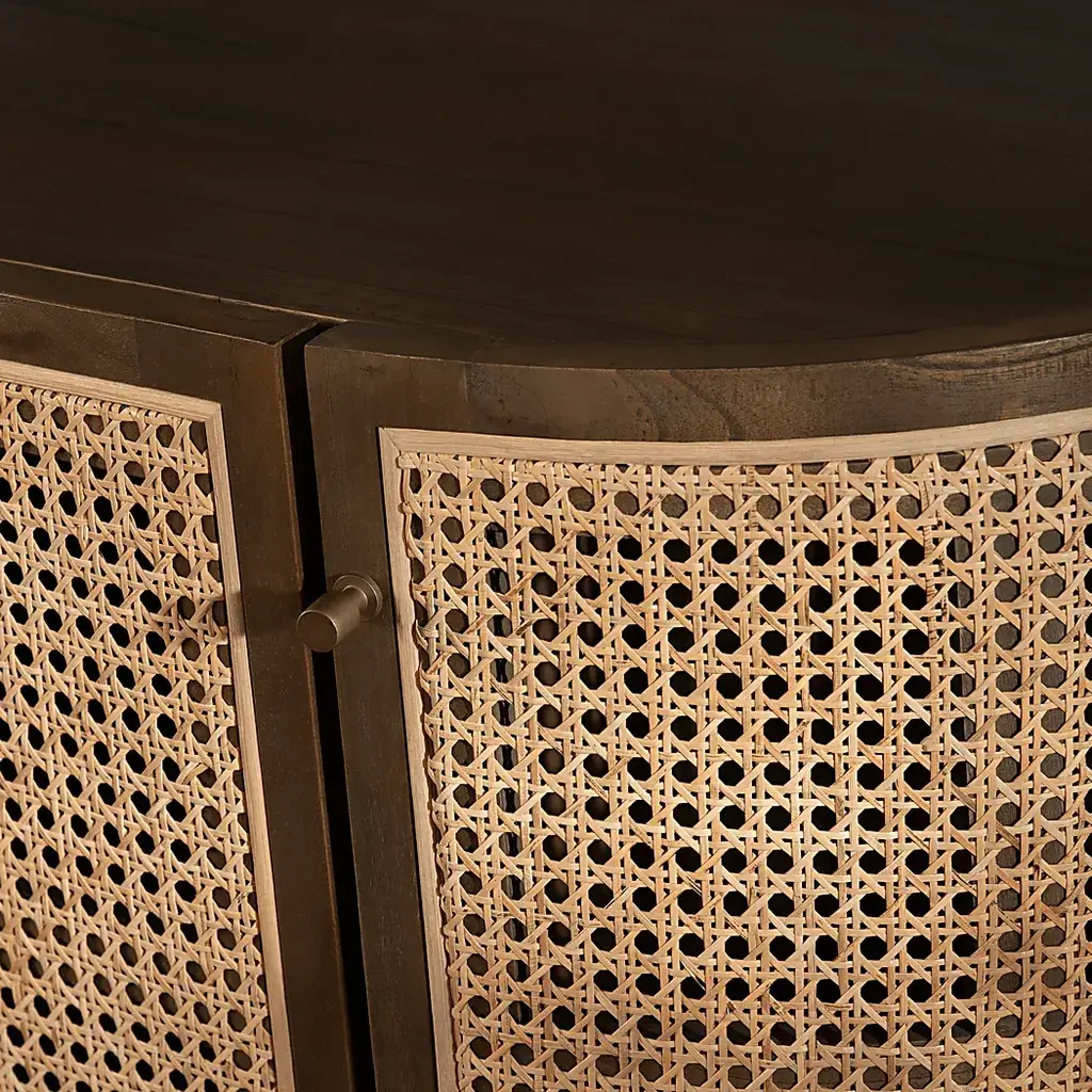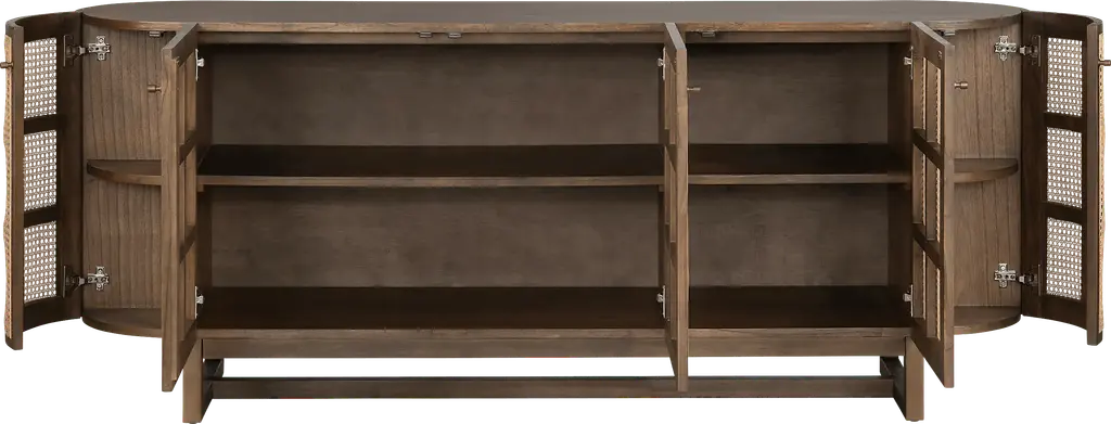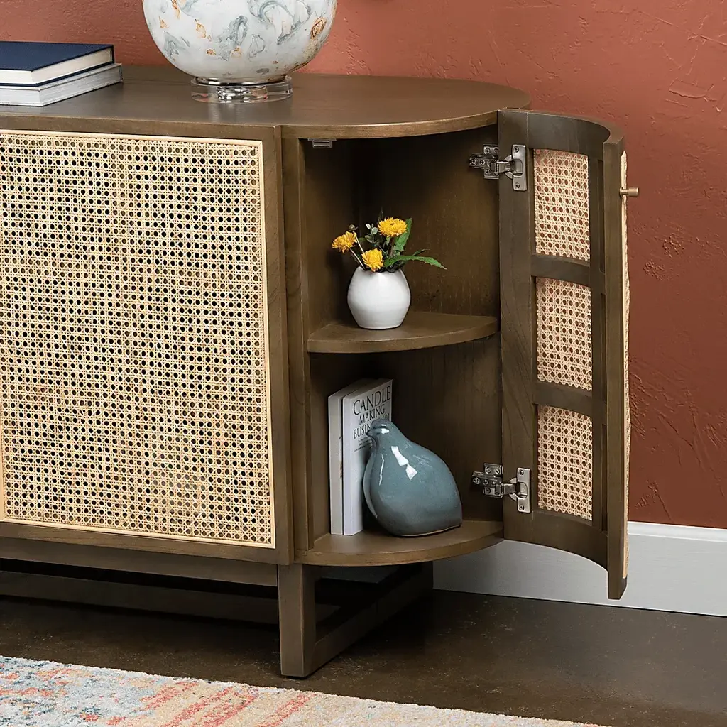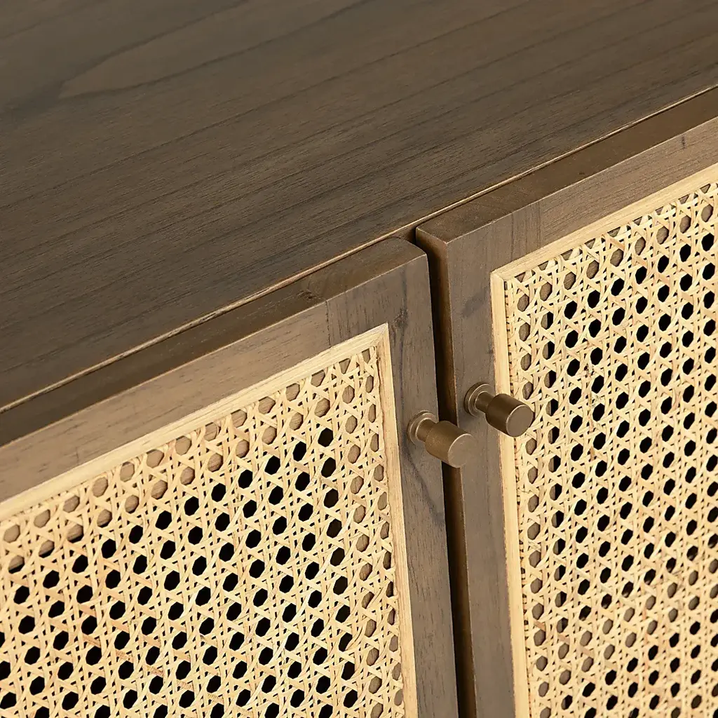 Enhance your living space with the Nemoair brown sideboard, a blend of rustic charm and modern elegance. Crafted from mindi wood in a warm brown natural wood grain finish, it features 5 woven cane doors, each with European hinges and antique brass round knobs. Inside, 4 fixed shelves offer ample storage, while rounded edges add a soft touch. Cord management ensures a tidy setup. With adjustable levelers, this piece is both beautiful and functional. Customer assembly is required.
