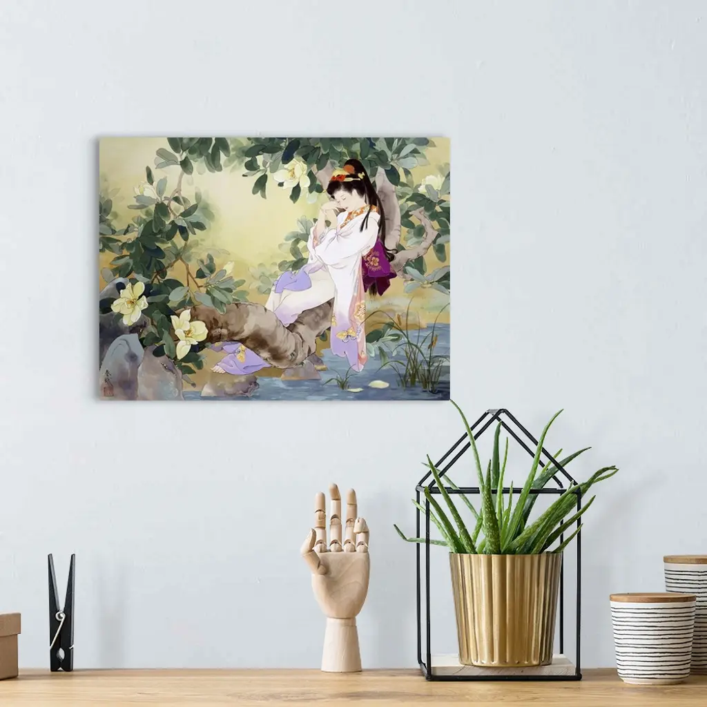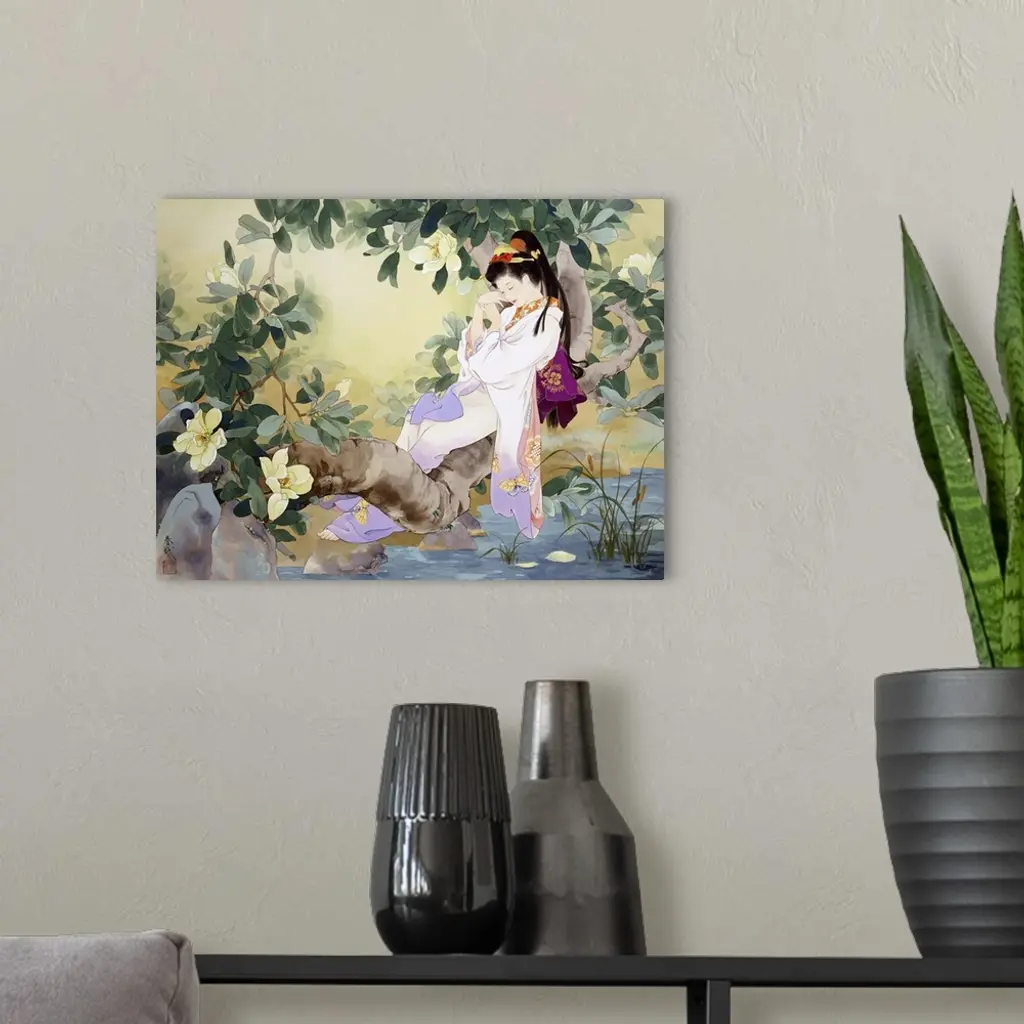 Contemporary colorful Asian art of a Geisha in beautiful ornate clothing.