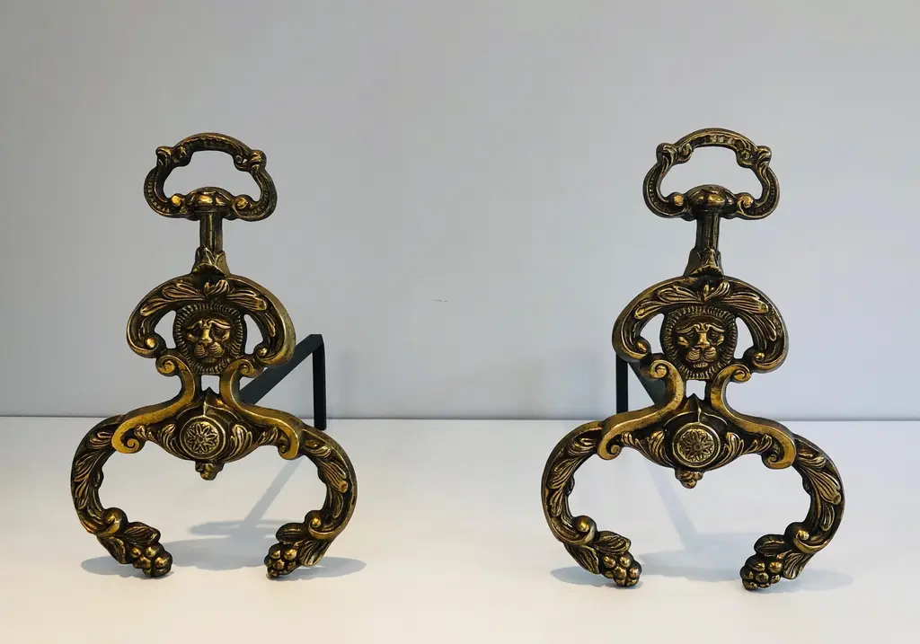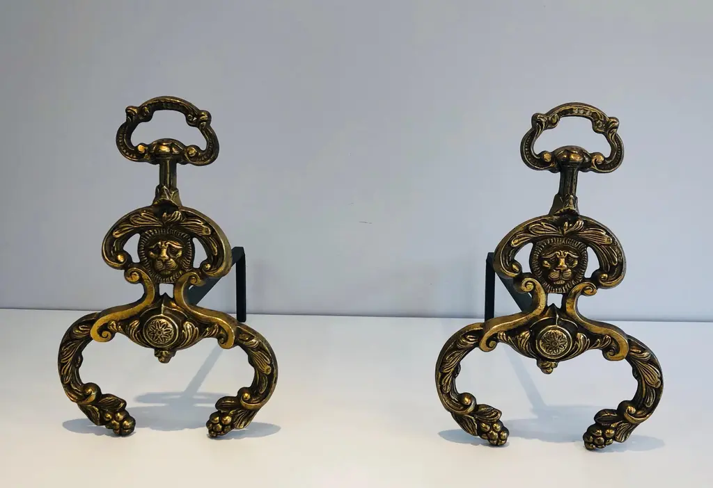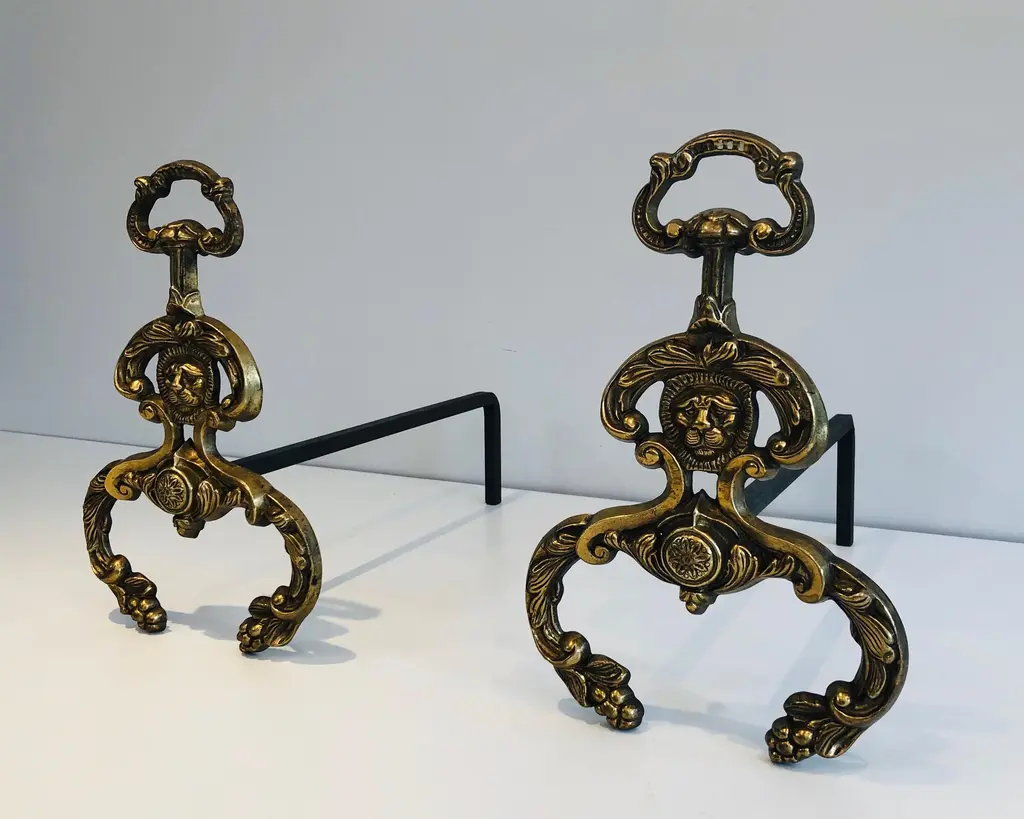 Neoclassical Style Bronze & Wrought Iron Andirons With Lions Faces. F - A Pair