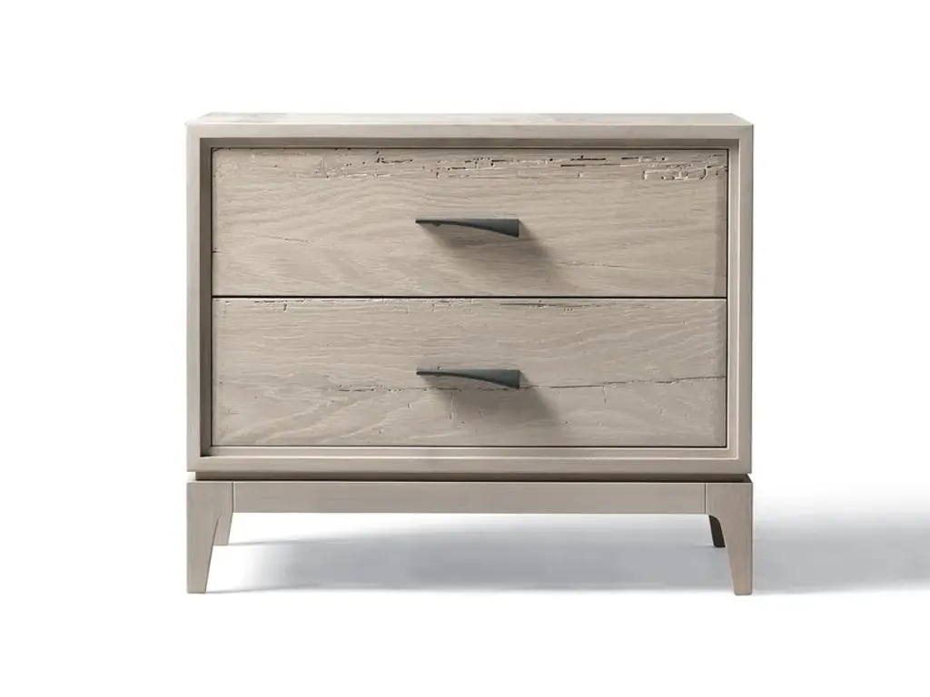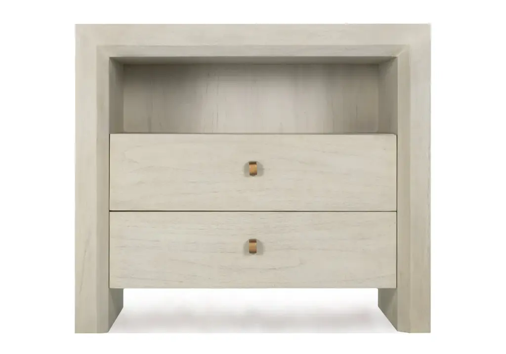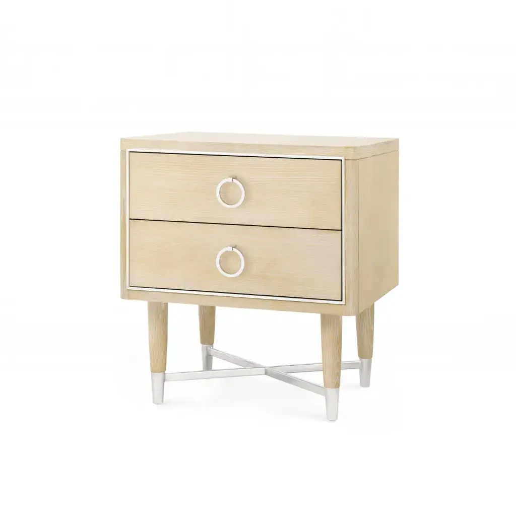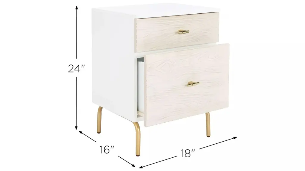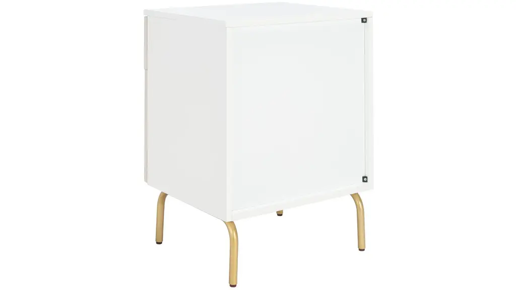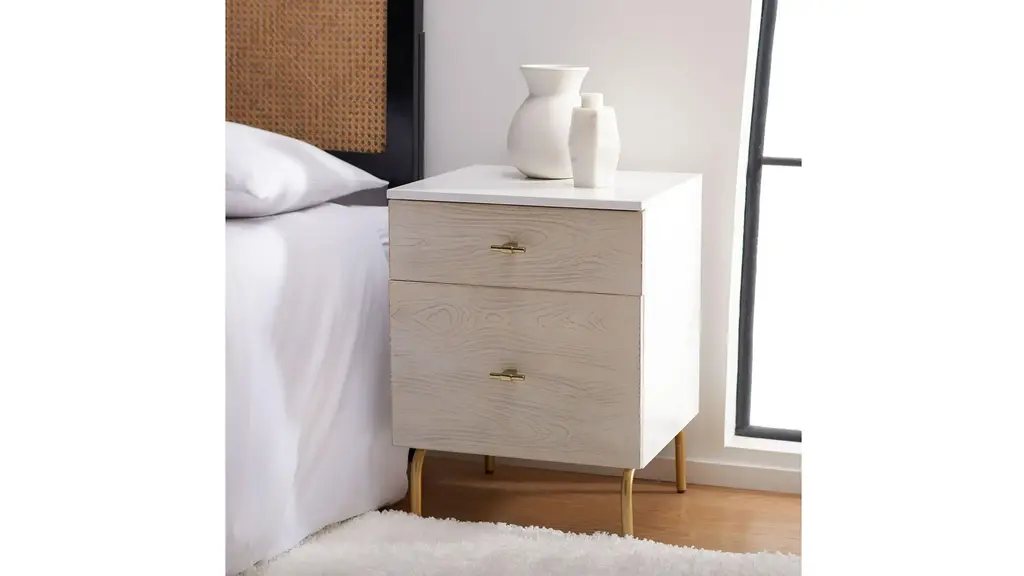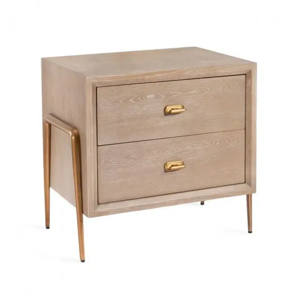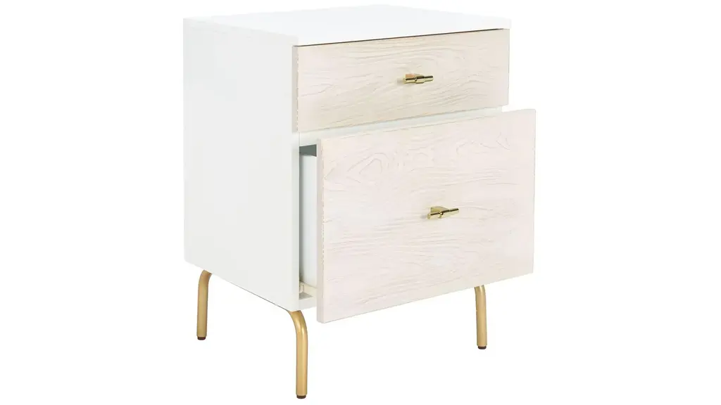 Elegant and modern, the natural beauty of the Nero nightstand adds style and warmth to any bedroom. Finely crafted of mahogany wood, Nero's rich white finish and gold metal legs give it vintage style charm. Two spacious drawers make for easy storage.