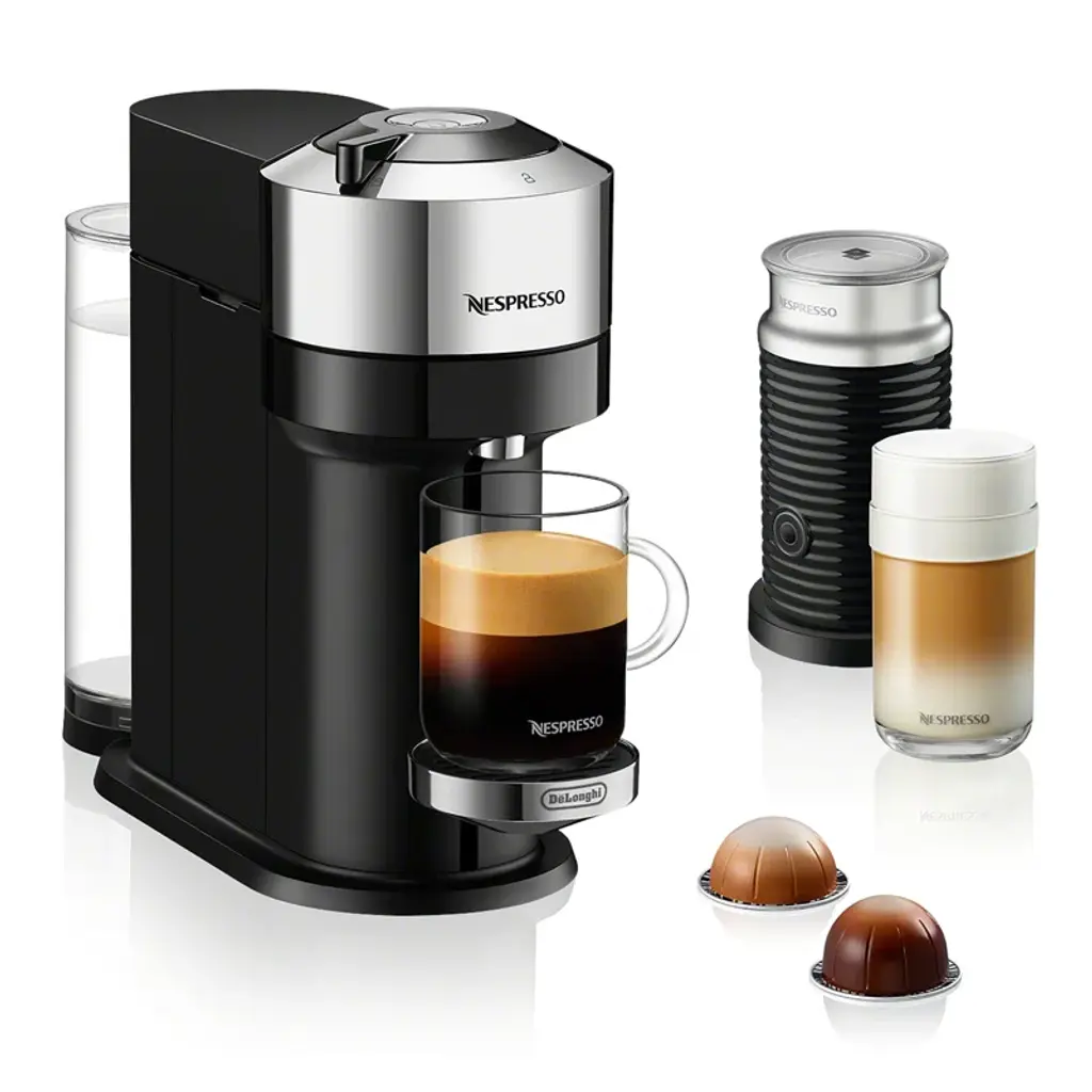 Enjoy pure espresso or frothy coffee drinks at the touch of a button with this compact espresso maker. Using the convenience of single-serve capsules, the coffee maker offers the option of espresso or lungo as well as a selection of three milk-based drinks: espresso macchiato, cappuccino and latte macchiato. The counter-worthy coffee maker has a compact design, glossy black finish and chrome accents.Nespresso of Switzerland created the first coffee pod system over 40 years ago. Founded in Treviso, Italy, De'Longhi has been manufacturing appliances and parts since 1902.We now offer an in-store coffee capsule recycling program. Bring your empty aluminum Nespresso pods to Crate & Barrel and they will be recycled.