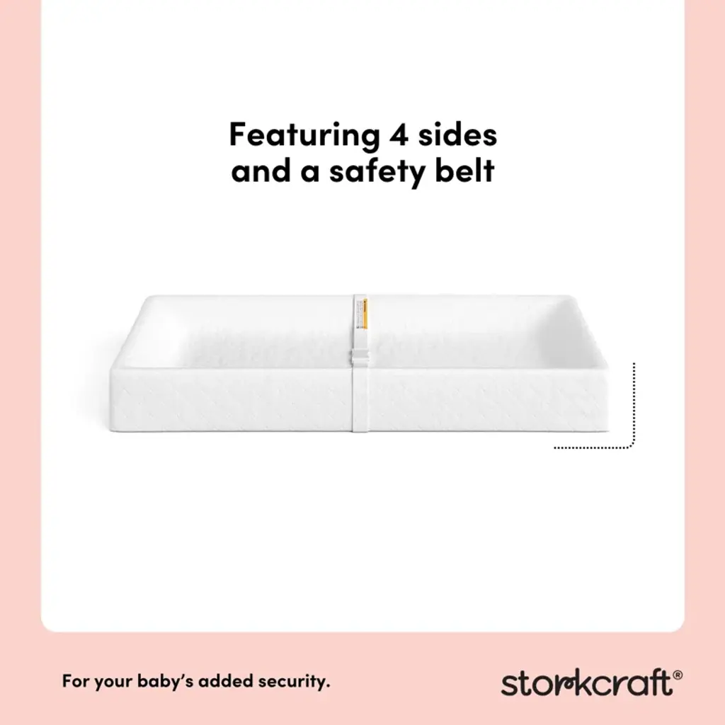 The Storkcraft Nest 4-Sided Contoured Changing Pad is designed to make changing your baby a secure, comfortable, and clean process that provides enhanced nursery convenience. Crafted with your family's well-being in mind, the Storkcraft Nest is GREENGUARD Gold Certified, Formaldehyde-Free Certified, and JPMA Certified. For enhanced safety, it features four contoured walls and a safety belt to help keep your baby securely in place. To ensure stability, the Nest Changing Pad includes two safety straps to secure it to your changing surface, along with a non-skid bottom to help prevent shifting. It is water-resistant and designed to fit most standard-size changing toppers (16 inches x 32 inches, up to 30 lbs). This pad has been expert-tested by independent third-party laboratories to meet rigorous safety standards. For added confidence, the Storkcraft Nest 4-Sided Contoured Changing Pad is backed by Storkcraft's 1-year limited warranty. Exclusively from Storkcraft, proud recipient of the Parent Tested Parent Approved (PTPA) Seal of Approval for nursery and children’s bedroom furniture.