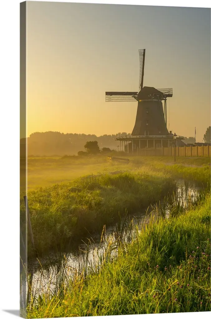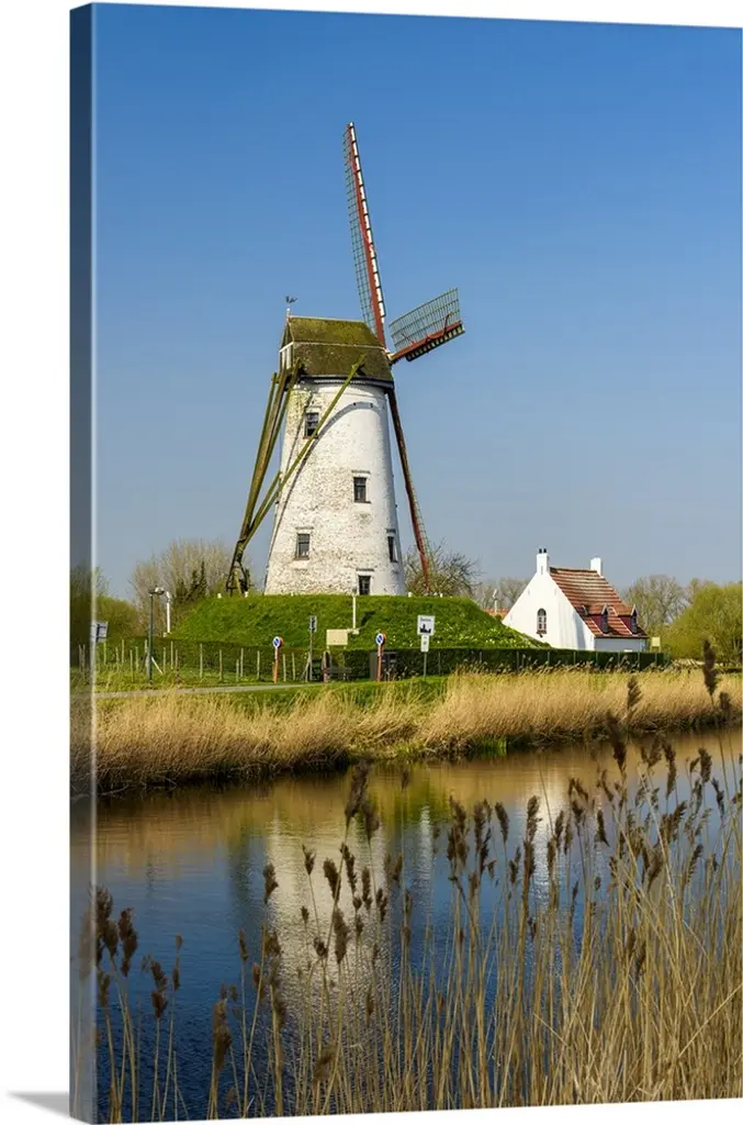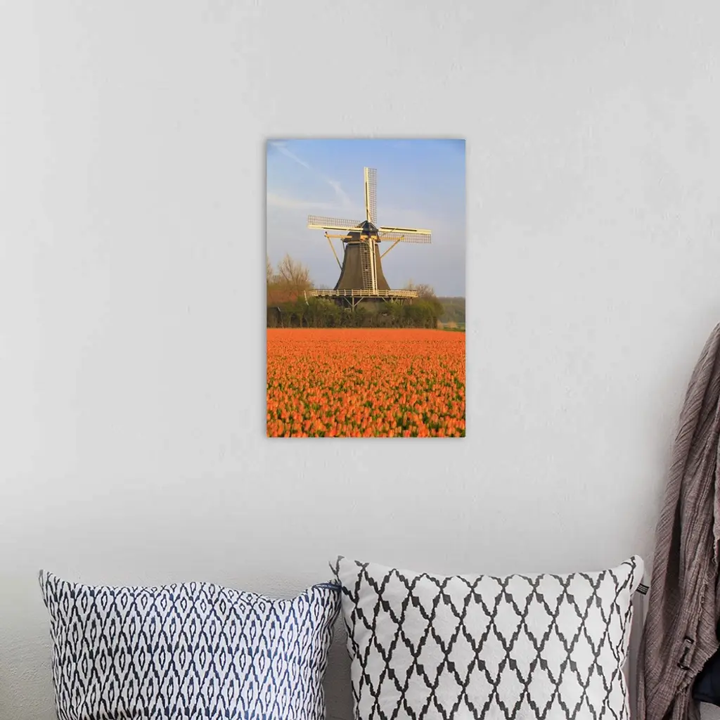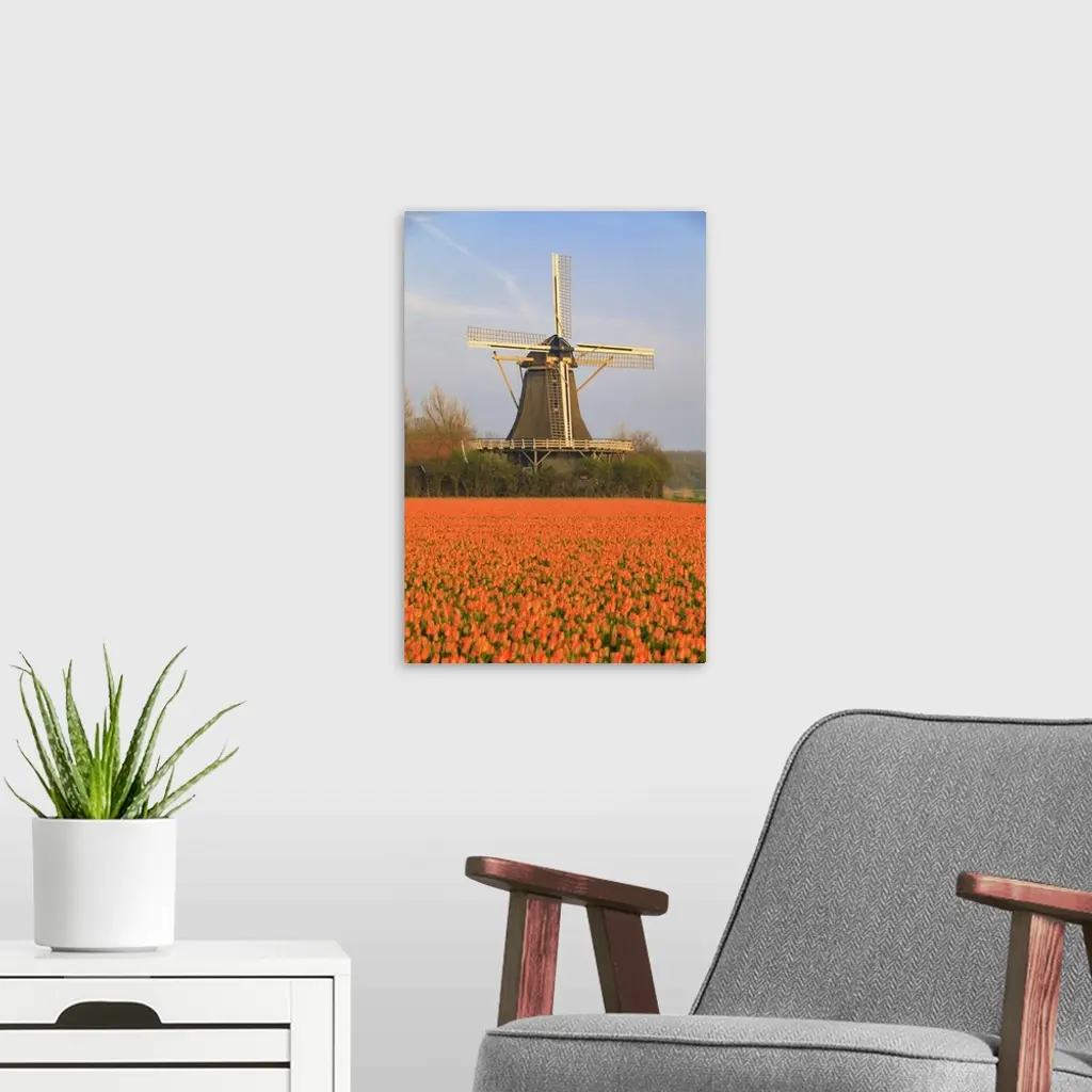 Netherlands, North Holland, Tulips In Fields Around Het Zand, Windmill In Distance
