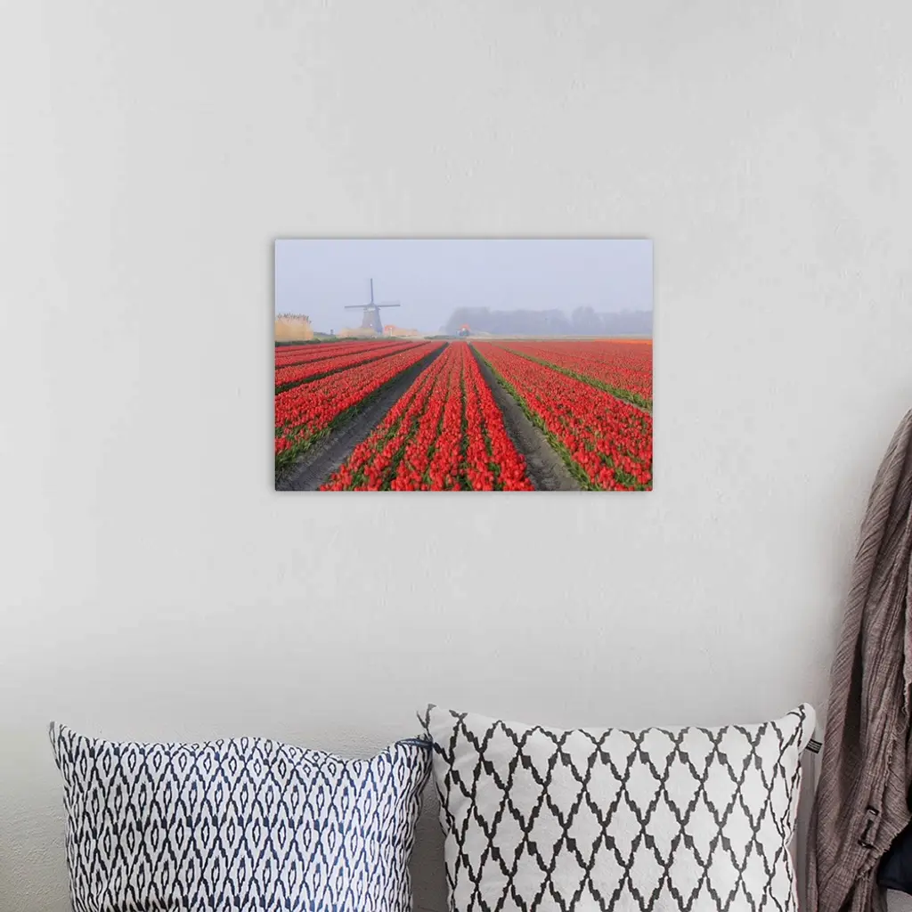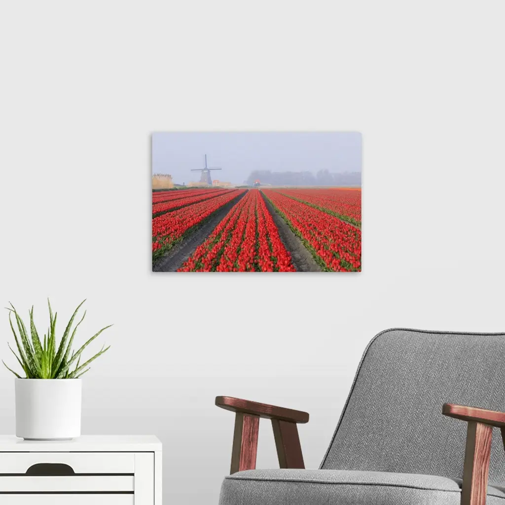 Netherlands, North Holland, Tulips In Fields Around Het Zand, Windmill In Distance