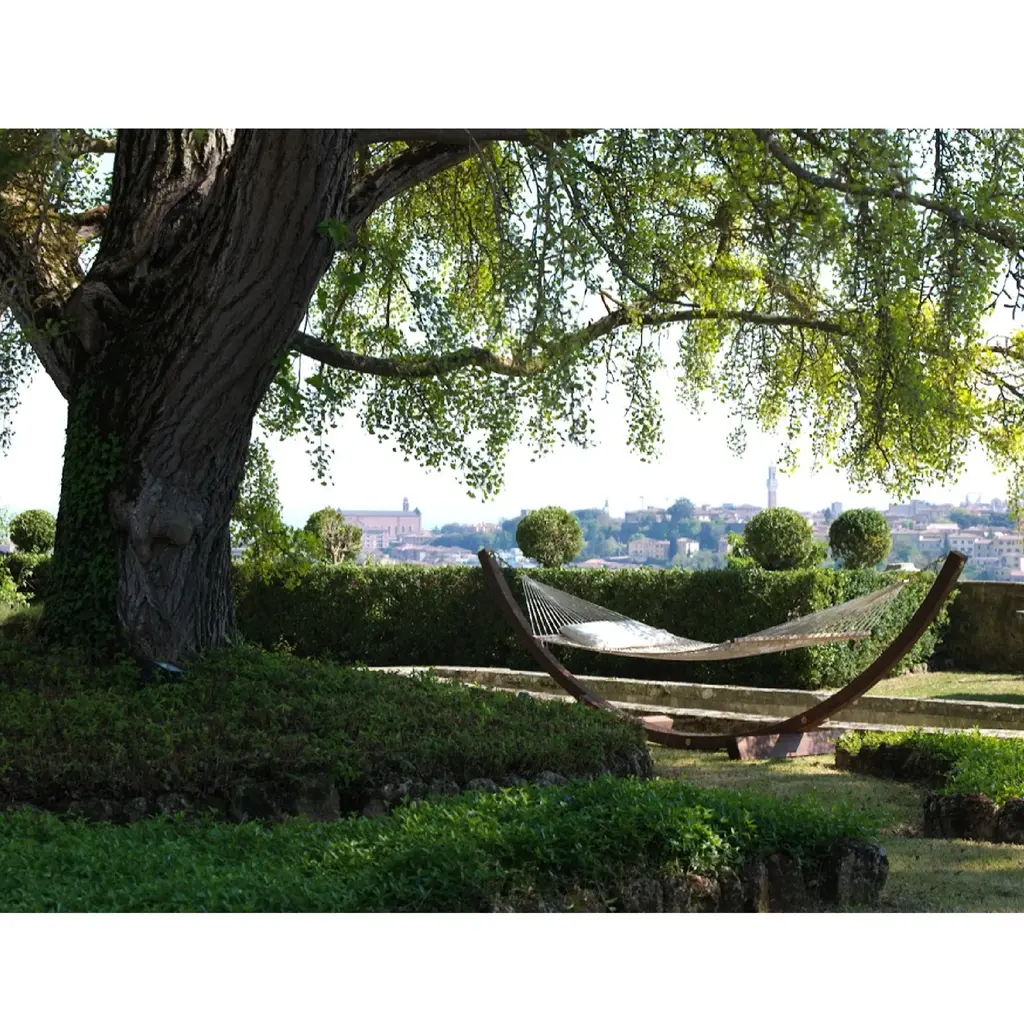 Experience luxury and relaxation with the Netted Outdoor Hammock by Unopiu Amanda. This timeless hammock features curved wooden poles and a handwoven net, creating a unique and innovative self-supporting design. Enjoy the ultimate comfort and style in any location, without the need for trees. Elevate your outdoor oasis with AMANDA.