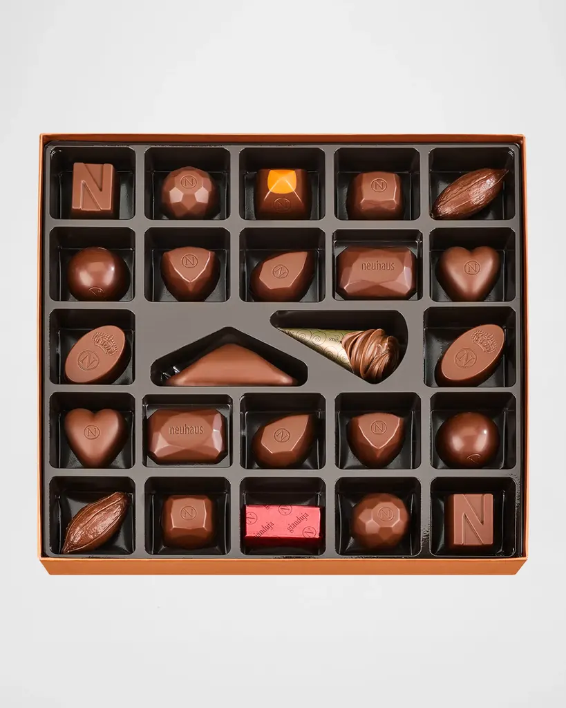 Collection of 24 timeless Neuhaus milk filled chocolates in elegant gift box Hand-filled with pralinés, ganaches, and caramels Made without GMOS and palm oil Approx. 8.78”L x 1.2”T Net. wt. 9.3 ounces Made in Belgium Contains allergens: Peanuts and sesame_seeds undefined