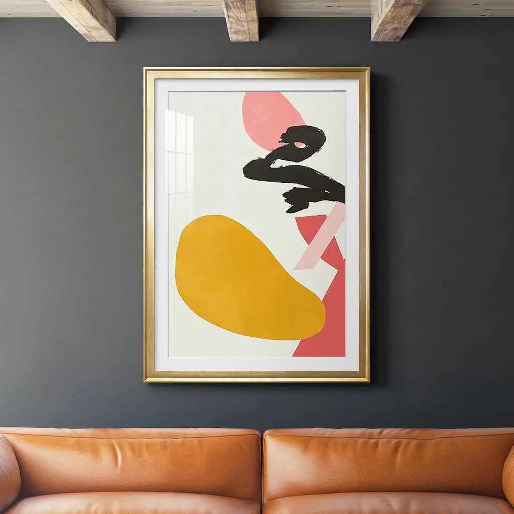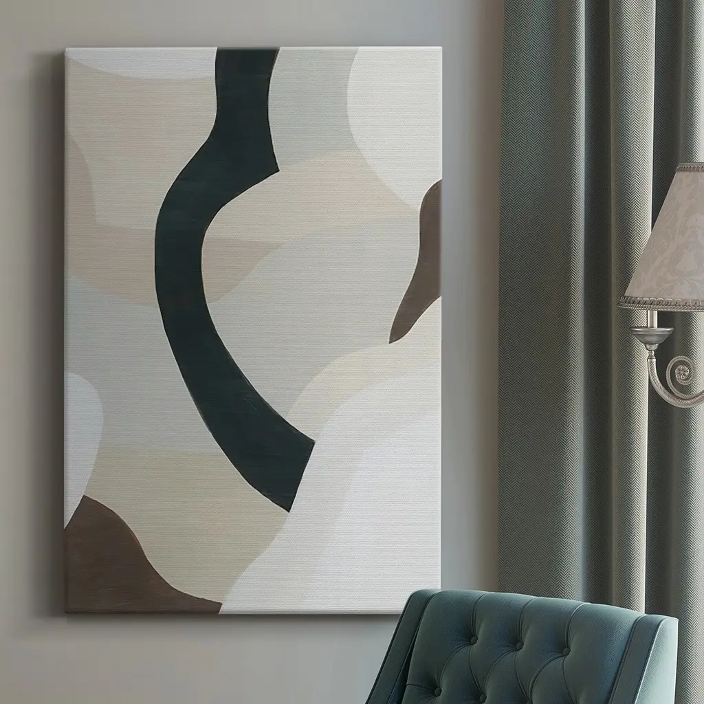 An exciting abstract, this giclee on a gallery wrapped canvas framed in a natural wood brings visual texture and interest. Its dark shapes and complemented by white space for a captivating piece. Hang vertically or horizontally, creating an individual look in any room.