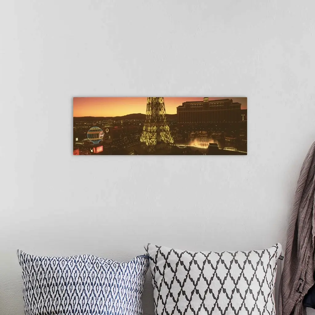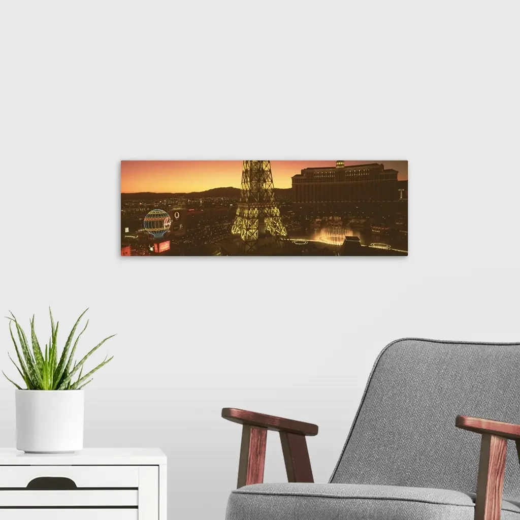 Panoramic photograph from a high angle of Las Vegas at night, including Paris, the Eiffel Tower and the Bellagio.