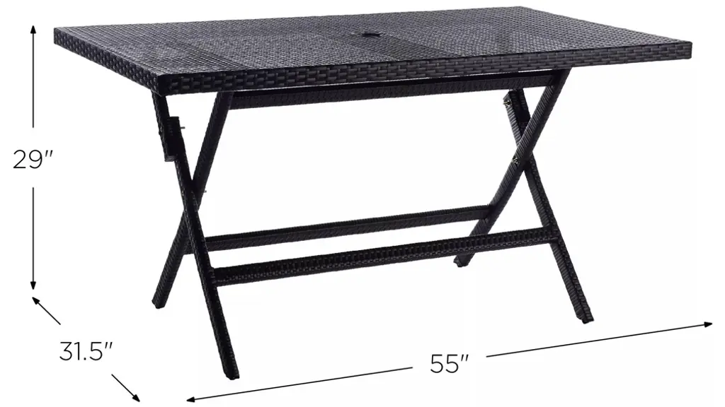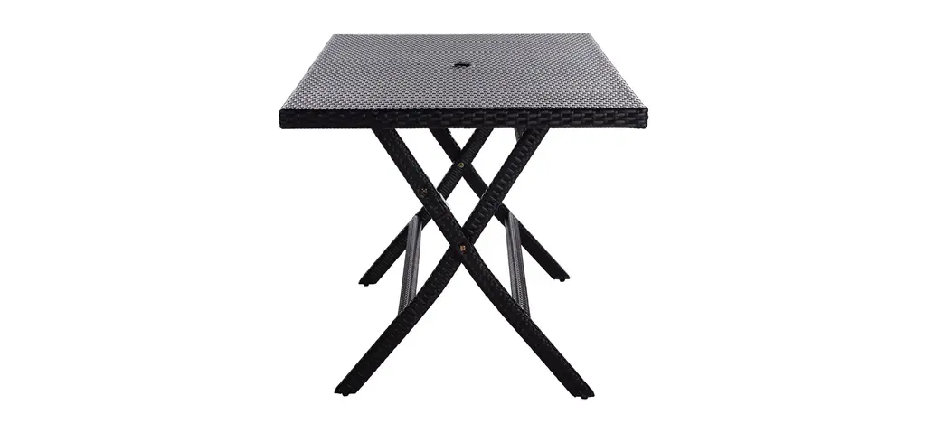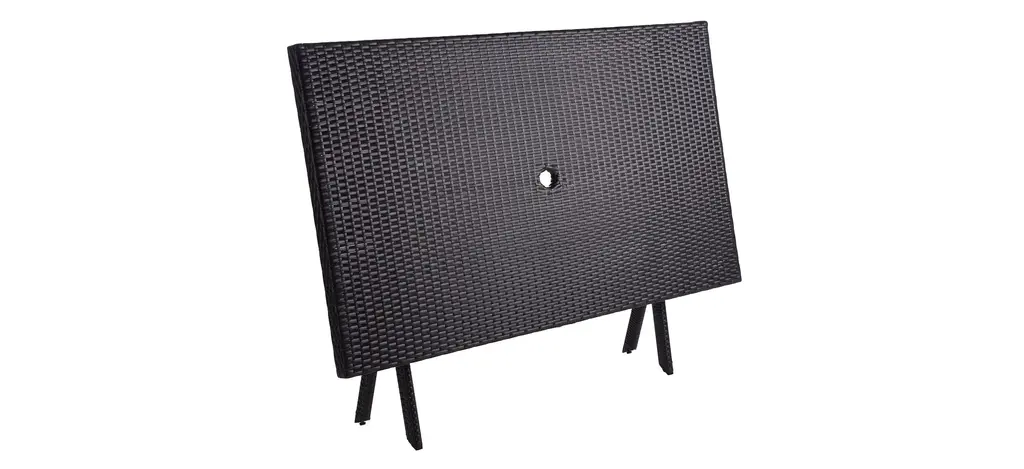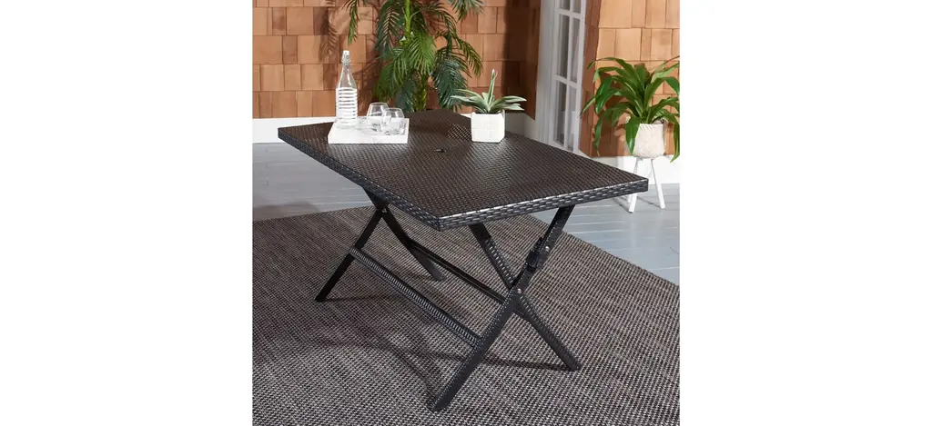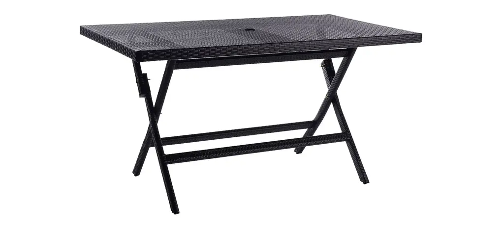 The Neval table perfectly blends the functionality of a folding table with the high style needed for chic outdoor dining. Styled in forever fashionable black, Neval's texture rich surface features a cut out in the center for umbrellas, allowing you stay protected from the sun's harsh rays.